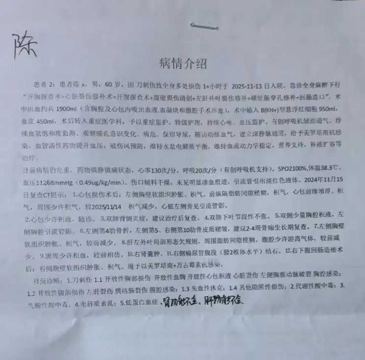 ICU昏迷多日每日医疗费万元 “他冲出去的时候,根本没顾上想自己已经60岁了。”11月17日,重庆市合川区的陈女士在筹款平台上的一句话,让无数网友揪心。她的父亲陈奎因见义勇为阻止楼道行凶,身中五刀陷入深度昏迷,至今仍在重症监护室与死神搏斗,而每日高达万元的医疗费用,让这个普通家庭不堪重负。 时间回溯到11月13日,陈奎正在家中休息,楼道里突然传来凄厉的呼救声。没有丝毫犹豫,他立刻起身冲出家门,眼前的一幕让他心头一紧:一名男子正对着一名女孩行凶。“不能眼睁睁看着别人出事”,怀着这份朴素的正义感,陈奎毅然上前制止,却不料行凶者穷凶极恶,挥刀向他猛刺五刀。 强忍着剧痛,陈奎用尽最后一丝力气联系了女儿。接到电话的陈女士一边紧急联系小区物业,一边拨打120急救电话。很快,救护车赶到现场,将重伤的陈奎和被救女孩一同送往合川区人民医院。经过7个小时的紧急抢救,手术暂时成功,但陈奎因伤势过重被直接送入重症监护室。 然而险情并未就此结束。事发次日,陈奎的伤情突然恶化,被紧急转运至重庆新桥医院。医院的病历单据显示,他的伤情包括刀刺伤、开放性胸部损伤、开放性血胸、开放性心包积液、心脏裂伤、血性休克等多项致命伤。“现在父亲面部浮肿得完全认不出来,和被救的女孩在同一个ICU里,每天都在闯生死关。”陈女士的话语里满是无助。 17日下午,记者从合川区较场坝社区工作人员处核实,事发时社区赶到现场时,陈奎与被救女孩均已昏迷,犯罪嫌疑人已被警方当场抓获。权威渠道消息显示,犯罪嫌疑人目前已被刑事拘留,陈奎的见义勇为行为属实,当地相关部门正为其申请见义勇为荣誉称号,并将落实帮扶措施。 据《见义勇为人员奖励和保障条例(草案公开征求意见稿)》规定,见义勇为人员的医疗费应由加害人依法承担,加害人无力承担的部分可由当地政府解决,各地也明确医疗机构对见义勇为负伤人员应开通“先救治、后收费”的绿色通道。但目前,高昂的治疗费用仍让陈女士一家陷入困境,无奈之下她选择发起筹款,希望为父亲争取一线生机。 一位六旬老人的挺身而出,是危急时刻最动人的勇敢;而英雄身陷困境,更需要社会的温暖托举。目前,筹款通道仍在开放中,网友们的爱心正在汇聚。我们期待相关帮扶措施尽快落地,更期盼这位见义勇为的老人能早日挺过难关,平安归来。