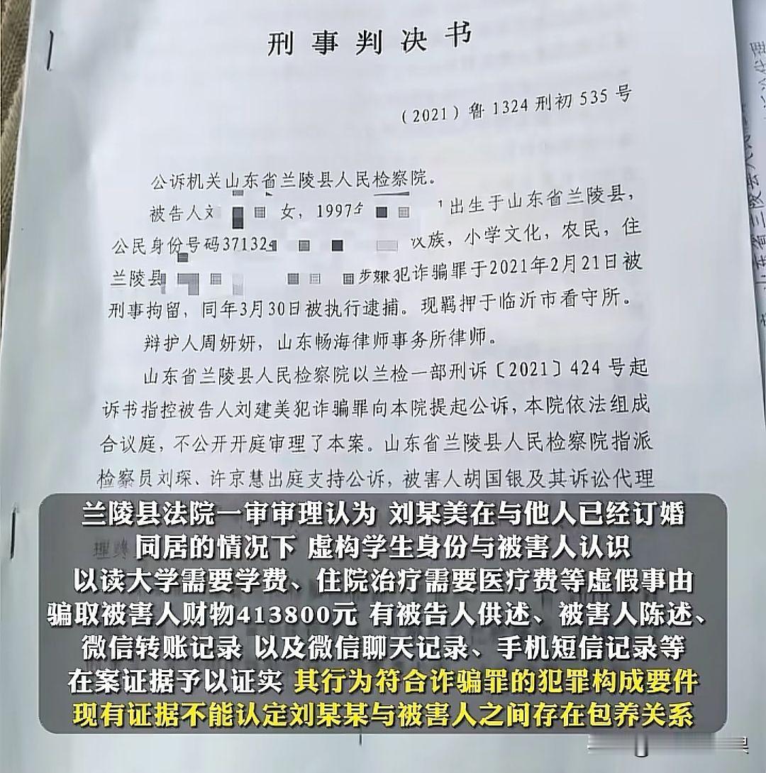山东兰陵,一19岁女子经宾馆老板介绍,以在校学生的身份与一位曾担任过村支书的男子发生了关系。此后女子不断以学费、治病等为由,向男子索要了143万余元,还隐瞒了结婚生子的事实。案发后,一审法院认定女子共计诈骗41.38万元,处5年有期徒刑、罚款10万元。然而在女子在上诉时坚称自己是被男子包养的,并不是诈骗后,二审法院给出了不同意见。(来源:法治现场) 据悉,2016年,当时年仅19岁的女子刘某已经是某宾馆的常驻人员,而她的真实身份其实是一名失足女。 后来宾馆老板将刘某包装成一位在校大学生,然后将其介绍给男子胡某。胡某在当地有一定社会地位,还当过村支书,二人初次见面就在宾馆发生了关系,之后便通过微信长期保持着联系。 期间,刘某多次以大学学费不够、生病住院等理由找胡某要钱花。胡某也十分大方,每次都是几千几万的转,也没怀疑过刘某。 2020年,胡某察觉到不对劲,便对刘某的身份进行了调查,在得知刘某并不是大学生,而是一名失足女,而且还是结过婚生过孩子的失足女后,气得报了警。 后检察院调查发现,刘某的确故意隐瞒了自己的身份,其目的是为了骗胡某的钱,且已经骗得143万元,故以诈骗罪为名,对刘某提起了公诉。 2023年7月7日,一审法院结合有效证据,认定刘某只骗了胡某41.38万元,但这也已经构成诈骗罪。 《刑法》第266条规定,诈骗公私财物,数额较大的,处3年以下有期徒刑、拘役或者管制,并处或者单处罚金;数额巨大的,处3~10年有期徒刑,并处罚金。 最终,一审法院判处刘某5年有期徒刑,罚款10万元,并要求刘某退还胡某的损失。 对于一审法院的判决,刘某自然不服。刘某的辩护人也表示,二人应当属于包养关系。 刘某的母亲李某则表示,在2012年,54岁的胡某就包养了当时才15岁左右的刘某,期间胡某多次用裸照威胁刘某与其发生关系。 后来刘某结婚,并在2017年生了个儿子,可胡某还是继续威胁刘某发生关系。不仅如此,胡某还发朋友圈说刘某生的儿子是他的,这导致刘某与丈夫离了婚。 再后来,胡某当上了村委书记,然后利用职权让公安和检察院协助指控刘某诈骗。 如果按照李某的说辞,胡某与刘某其实早就认识了,并非案情介绍的2016年才认识。而当时如果胡某利用裸照威胁尚未成年的刘某发生关系,那肯定是构成强奸罪的。而强奸未成年少女,应当从重处罚。 不过,李某的说辞无从考证,反而是刘某冒充大学生要求胡某给她钱花;谎称生病住院让胡某给其医疗费的证据确凿。 《刑事诉讼法》第55条规定,对一切案件的判处都要重证据,重调查研究,不轻信口供。只有被告人供述,没有其他证据的,不能认定被告人有罪和处以刑罚;没有被告人供述,证据确实、充分的,可以认定被告人有罪和处以刑罚。 因此,胡某是否构成强奸罪,还需要李某提供更为可靠的证据,否则可能会成为诬告陷害。 那二审法院对于刘某的上诉请求,会作何判决呢? 二审法院调查发现,根据胡某与刘某的聊天记录以及转账记录来看,刘某明知自己不是大学生,却谎称自己是大学生,而且也隐瞒了已婚事实,其目的就是骗取已经订婚的胡某的钱财41万余元,用于生活消费。 至于包养与被包养的证据,二审法院认为现有证据不足以证明,所以认定刘某存在非法占有的主观目的,对于辩护人提出的包养关系的主张,未予支持。 不过,二审法院认为胡某自身也有过错,所以将刘某的5年有期徒刑,改判为4年9个月有期徒刑。 最后,在现实生活中,像这种“感情 + 金钱”的案子,界限的确十分模糊,要是有人打着恋爱或者同居的旗号,长期找对方要经济支持,到底算不算诈骗,没有个固定的说法,需要结合具体案情具体分析。 有网友认为,要是两人真有恋爱关系,给的钱就不能轻易认定为诈骗所得。对此,您怎么看?