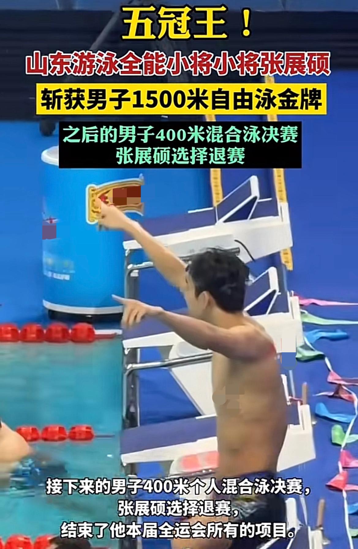 自己的孩子自己疼!张展硕1500米夺冠后,400米退赛,很多网友表示:退得好! 不得不说,这赛程安排的,真是一言难尽,1500米、400米还有一个100米接力,一个紧接着一个,这明摆着,让山东队做选择题。 张展硕游完1500米,如果再参加400米的比赛,太疲劳了,对身体来说,会是一种伤害。 大家觉得,张展硕400米退赛,是明智的选择,也是对运动员的保护。 夺牌固然重要,但是,运动员的健康更重要!为山东队做出的这一个选择点赞! 18岁的张展硕,一人得5金,已经足够亮眼了!