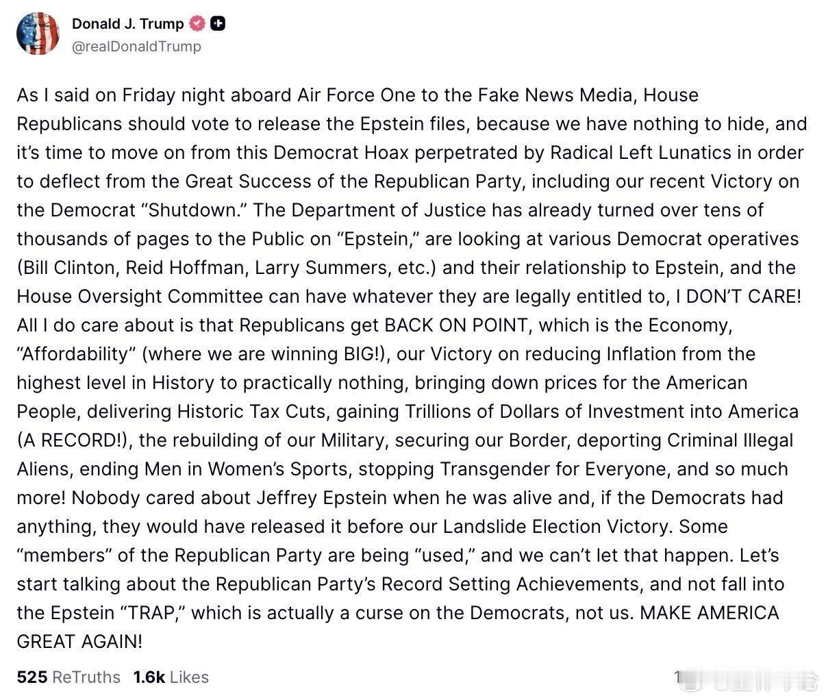 最新消息:川普称共和党人应该公布爱泼斯坦的档案,“因为我没有什么可隐瞒的”。“正如我星期五晚上在空军一号上对“假新闻媒体”所说的那样,共和党众议员应该投票公开 Epstein 档案,因为我们没有什么可隐瞒的,是时候从这个由激进左翼疯子制造的“民主党骗局”中走出来了——他们只是想转移大家对共和党巨大成功的注意力,包括我们最近在民主党“关门”行动中的胜利。司法部已经向公众公布了数万页关于“Epstein”的文件,正在调查多名民主党要员(比尔·克林顿、Reid Hoffman、拉里·萨默斯等)以及他们与 Epstein 的关系。众议院监督委员会可以获得所有他们依法应该得到的东西,我不在乎!我唯一关心的就是共和党能否重新聚焦在重点上,那就是经济、“可负担性”(我们在这方面赢得很大!)、我们将历史最高的通胀降到几乎为零的胜利,为美国人民带来更低的商品价格,推动历史性减税,为美国带来数万亿美元的投资(创纪录!),重建我们的军队、保护我们的边境、驱逐犯罪的非法移民、阻止男性参加女子体育、终止所有人的跨性别议程,还有更多!没有人在 Epstein 活着的时候关心他,如果民主党真有东西,他们早在我们压倒性赢得选举胜利之前就会公布了。一些共和党内的“成员”正被“利用”,我们不能让这种情况发生。让我们开始谈论共和党的创纪录成就,而不要掉进 Epstein 的“陷阱”——那其实是民主党的诅咒,不是我们的。让美国再次伟大!”👇