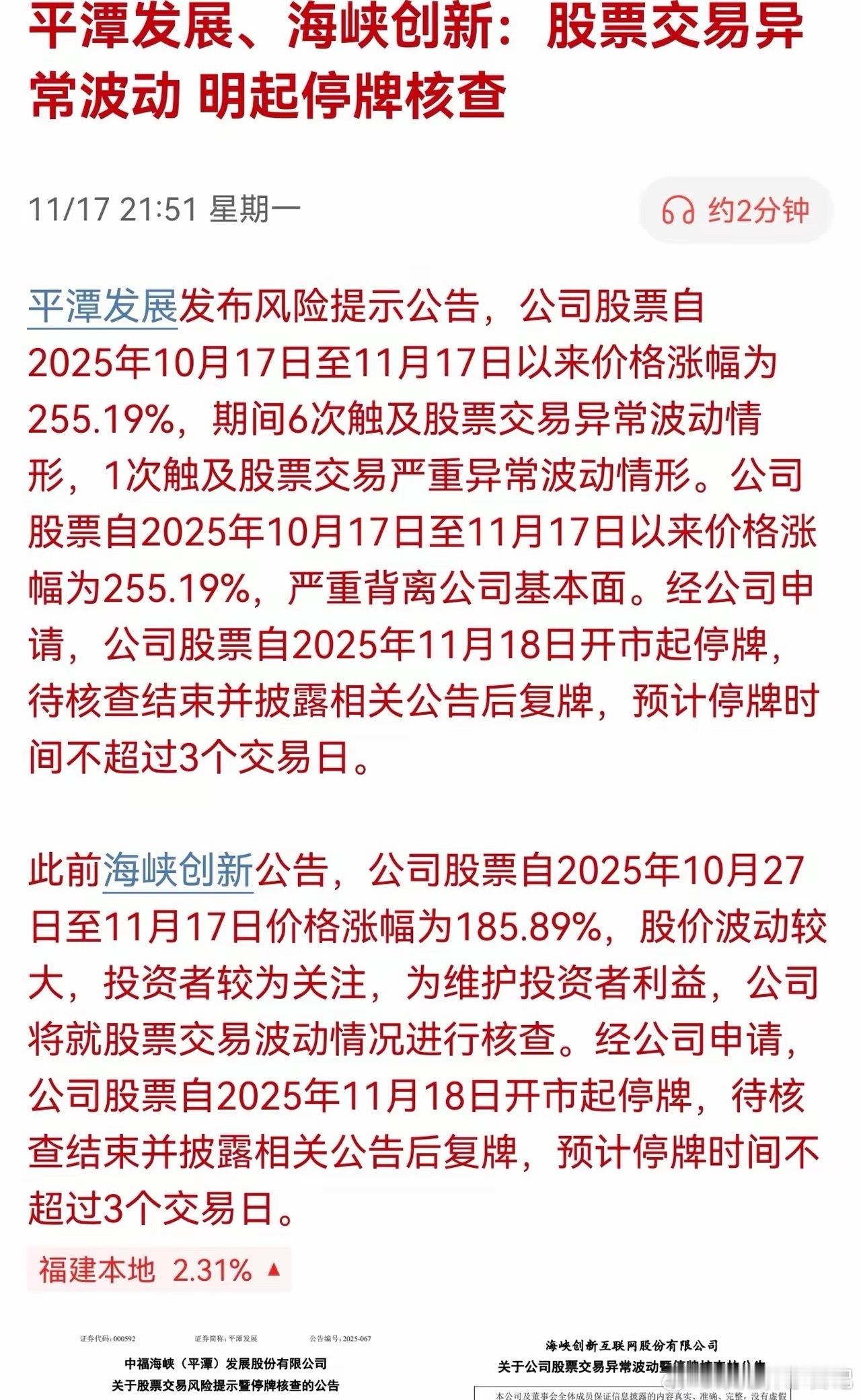 突发利空!三只标的接连停牌,福建板块短线或迎降温晚间资本市场突发重磅信号,福建板块多家高位标的密集披露停牌公告,为持续火热的短线行情泼下冷水。继合富中国今日因异动停牌后,平潭发展、海峡创新晚间接连发布停牌公告。值得注意的是,平潭发展与海峡创新近期短线涨幅已超200%,叠加此前合富中国的停牌,福建板块短短一日内已有三只标的因异常波动被监管关注。与固态电池、存储芯片等具备明确产业逻辑的赛道不同,福建板块本轮炒作缺乏核心底层逻辑支撑,更多依赖游资资金推动的短线情绪博弈。三只高位标的密集停牌,不仅标志着板块短线炒作已触及监管红线,更意味着本轮行情的高点或已正式到来。从市场规律来看,缺乏基本面支撑的题材炒作,在核心标的停牌降温后,往往容易引发资金集中出逃,进而导致板块退潮。对于持有相关标的的投资者而言,需警惕短线退潮带来的连续性调整风险,及时做好仓位管理。明日福建板块是否会迎来集体大跌?短线情绪降温已成定局,后续走势仍需关注资金出逃力度与市场承接情况。