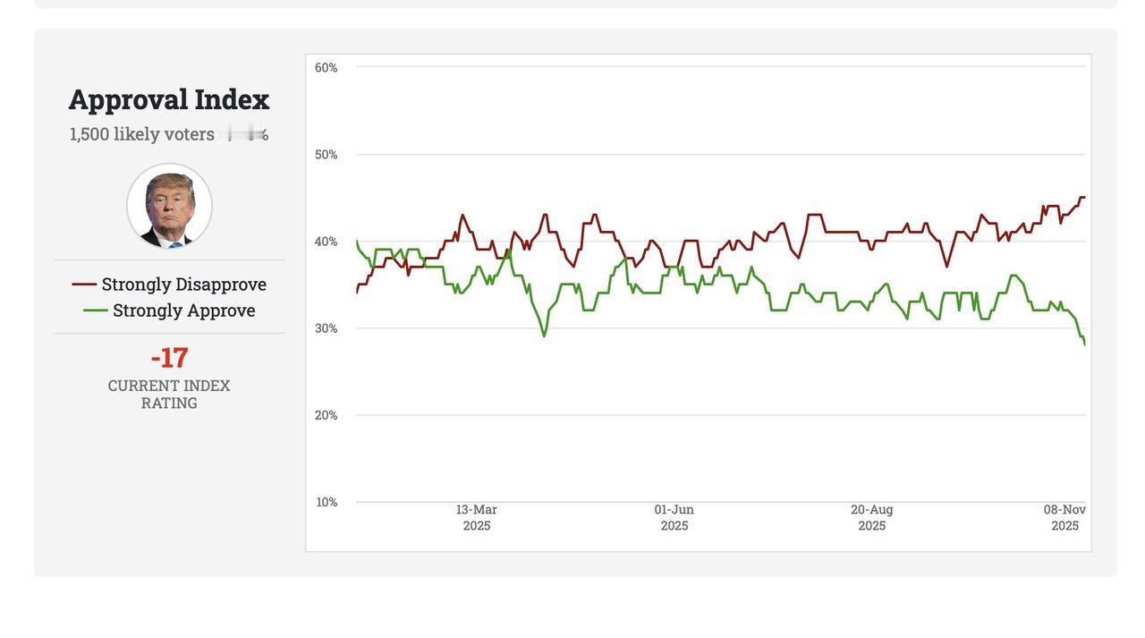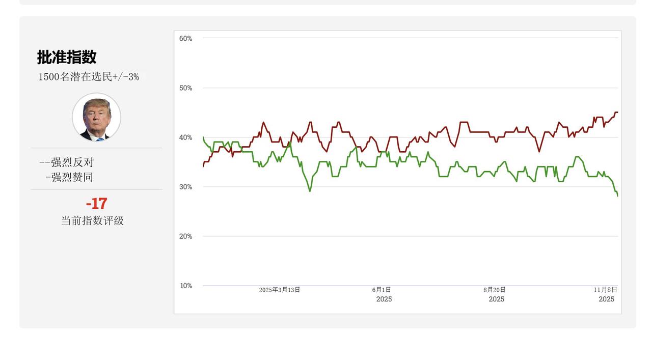 特朗普支持率首次大幅下滑:触及“道德底线”! 爱泼斯坦文件在2025年11月12日由众议院民主党主导强制公布后,特朗普的支持率出现了第二任期内首次真正意义上的大幅下跌。这不是小幅波动,而是从10月中旬的稳定在42%-45%(净支持-10%)滑至11月15日的37%-40%(净支持-18%至-22%),创下第二任期新低。 更关键的是,这次下滑首次侵蚀了他的核心MAGA基地,而非仅限于民主党或独立选民——这正是“雷区”所在:选民对“透明度”和“反精英腐败”的道德底线被触及。 公布的数千页文件显示,爱泼斯坦多次提及特朗普“知道那些女孩”,并有2003年特朗普寄给爱泼斯坦的生日卡片,附裸女画作并写道“我们有些共同点”。虽无直接犯罪证据,但文件强化了特朗普与爱泼斯坦的社交圈联系。 特朗普最初承诺“全面透明”,但文件公布后,他迅速转向。特朗普发帖称这是“民主党骗局”,并试图阻挡进一步释放信息如“客户名单”。这与竞选承诺背道而驰,引发共和党党内分裂。 最新民调显示,爱泼斯坦文件导致特朗普整体支持率下滑5-8个百分点,共和党内部支持率从90%以上降至80%-85%。 这次下滑标志特朗普“铁板支持”出现裂缝——不是经济或政策,而是道德雷区让“忠诚”变“失望”。