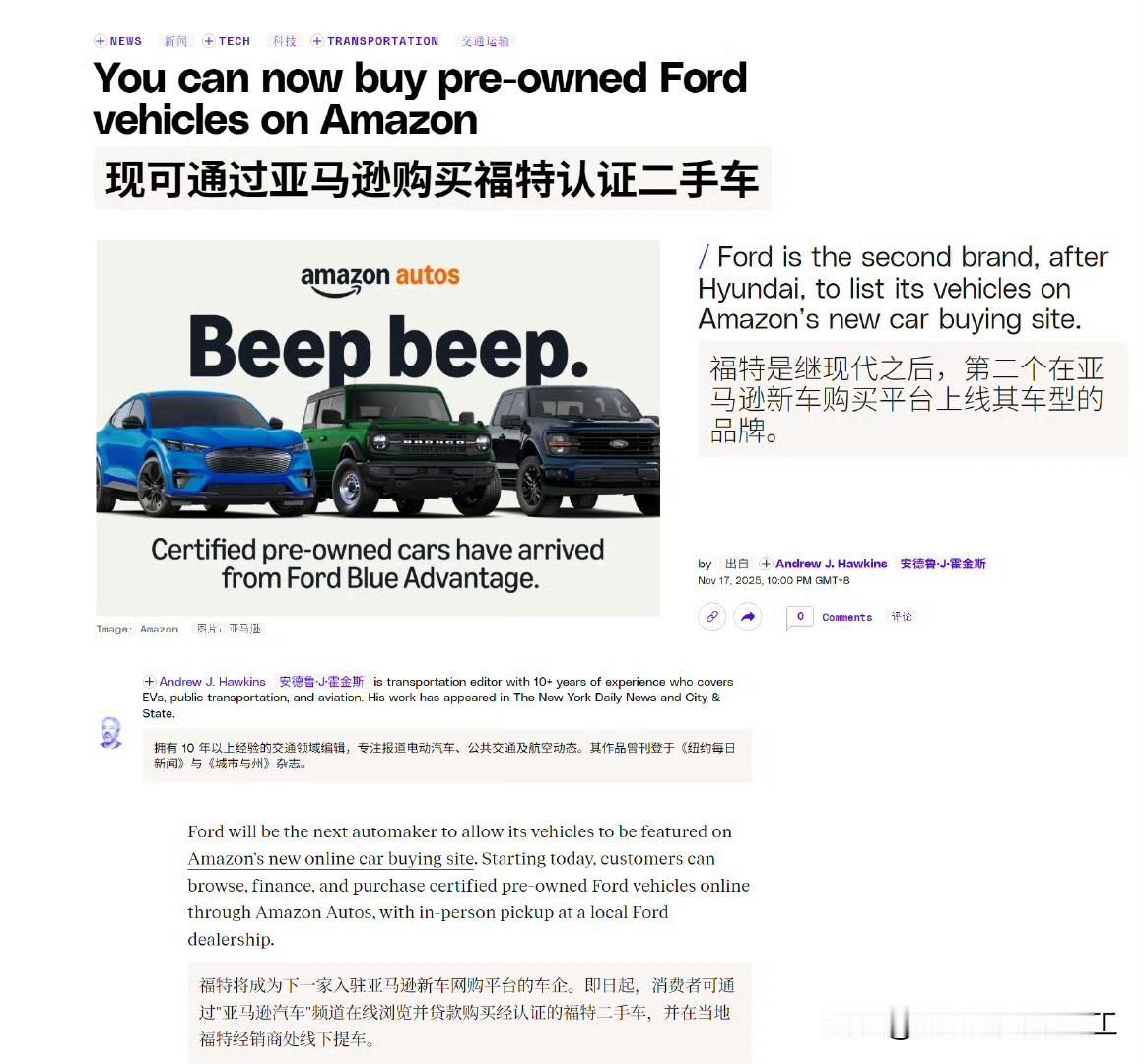 福特汽车与亚马逊达成协议,将在美国亚马逊网站直接销售认证二手车。