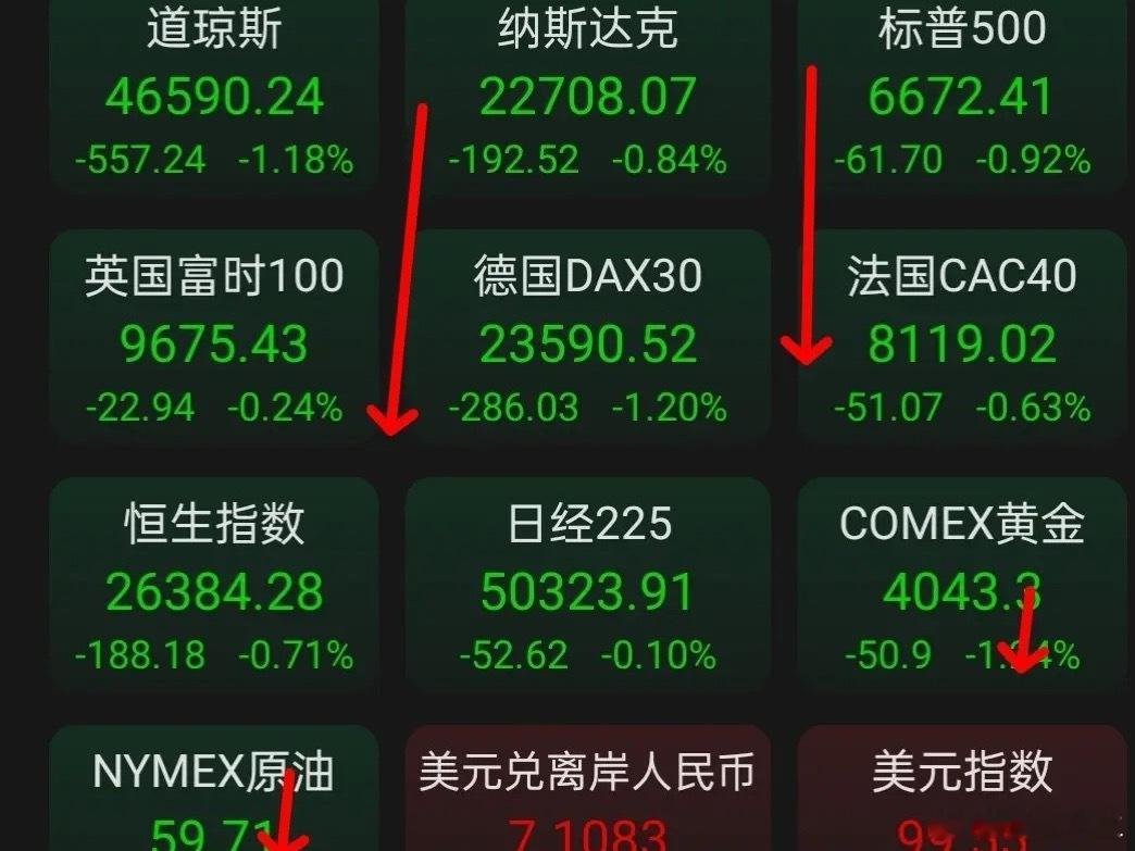 11.18外盘早餐,欧美股市普跌,恒生科技今天低开无疑。 周一,美道指跌1.18%,纳指跌0.84%,标普跌0.91%。英德法欧洲三大股指集体下跌。大型科技股多数下跌,其中英伟达苹果跌1.8%,美光科技高开低走跌2%,谷歌涨3%,特斯拉涨1.13。 美锂矿概念及储存硬盘板块涨幅居前。 热门中概股多数下跌,其中金龙指数下跌1.21,恒生科技指数期货下跌1.01。小鹏大跌10%,理想再鼎医药,未来,网易百度爱奇艺蔚来跌幅靠前,金山云大涨超8%,阿里涨2.54。光伏票晶科能源大涨13%。 期货黄金每盎司下跌51美元,石油期货小幅上涨。A50期指下跌0.52。 全球股市绿油油,A股承压,恒生科技继续低开走弱。 cpo板块受英伟达达抛售会有影响,人形机器人有望止跌反弹。 继续看好新能源板块。 点赞转发关注投资理财不迷路。