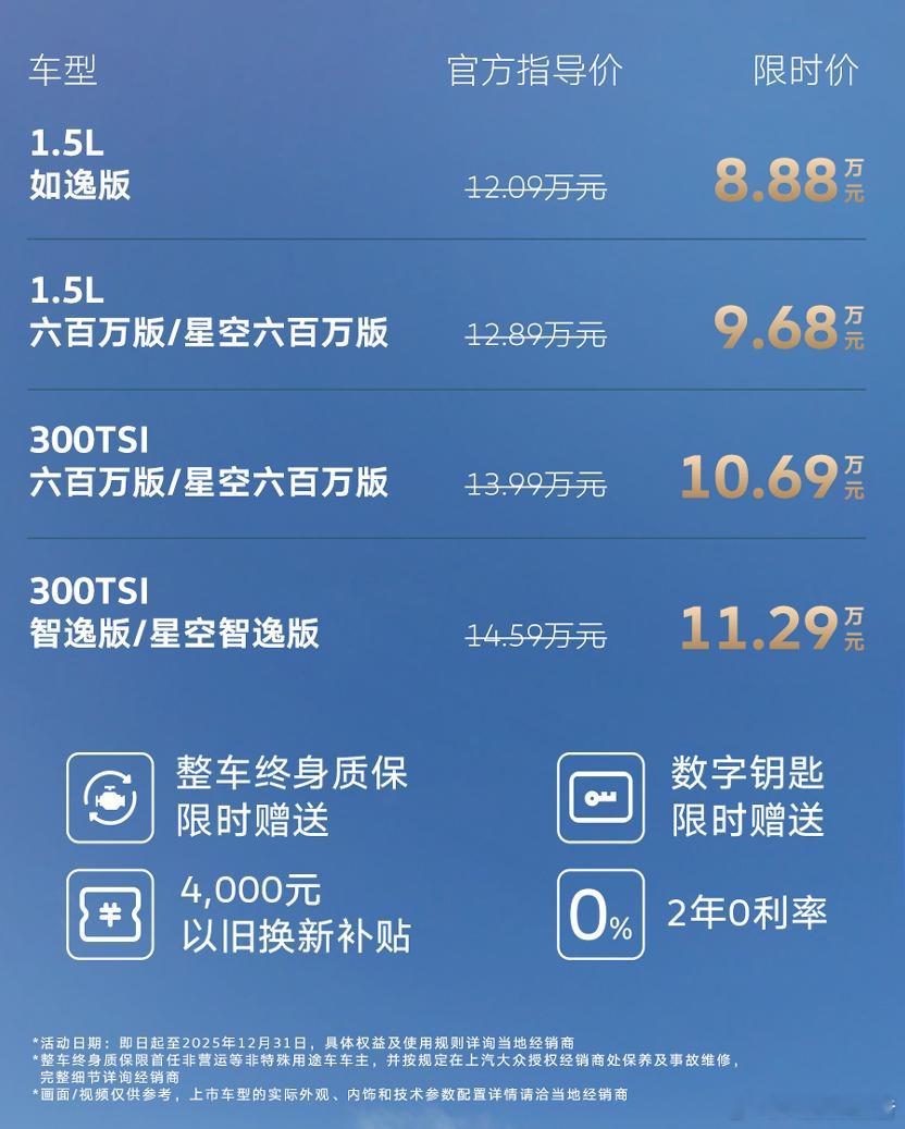 11月17日,上汽大众旗下全新一代朗逸Pro正式上市,共推出7款车型,售价区间为8.88-11.29万元。全新朗逸Pro长宽高分别为4720/1806/1482mm,轴距为2688mm,相比老款车身长度增加了42mm,高度增加了8mm,轴距以及车身宽度保持不变,后备箱容积增加至520L。内饰方面,配备10.25+12.9英寸的独立液晶仪表盘和中控大屏,车机搭载高通8155车规级芯片,整体的车控感受更为流畅丝滑。支持Apple Carplay、CarLife和HUAWEI HiCar手机互联。辅助驾驶方面,朗逸Pro搭载15个雷达与5个摄像头,拥有Travel Assist驾驶辅助系统、Front Assist前方辅助系统和IPA全方位智能自动泊车等功能。动力上,新车提供1.5L以及1.5T两款发动机,其中EA211 1.5L发动机最大功率81kW,匹配爱信6AT变速箱;1.5T EVO II发动机最大功率为118kW,匹配DQ200 7速双离合变速箱。