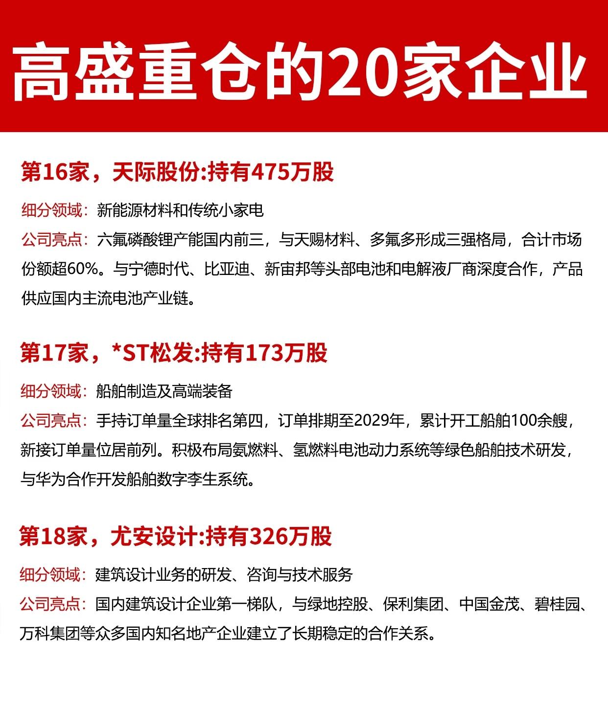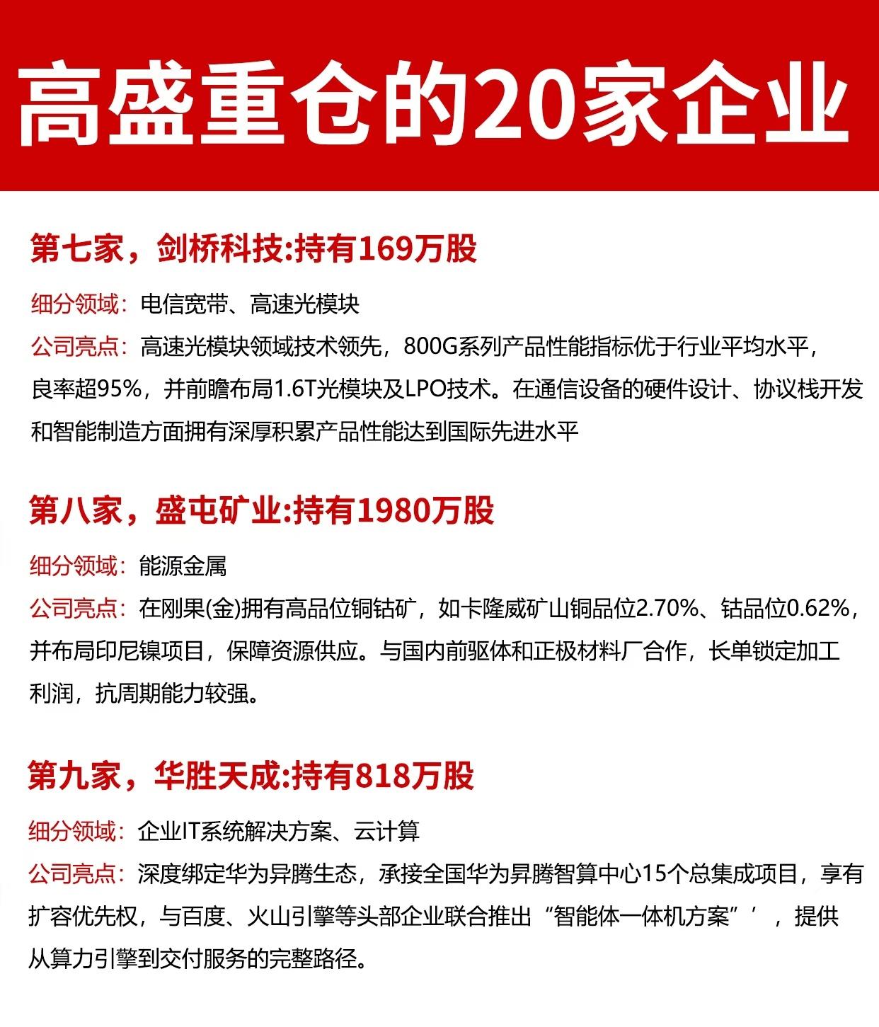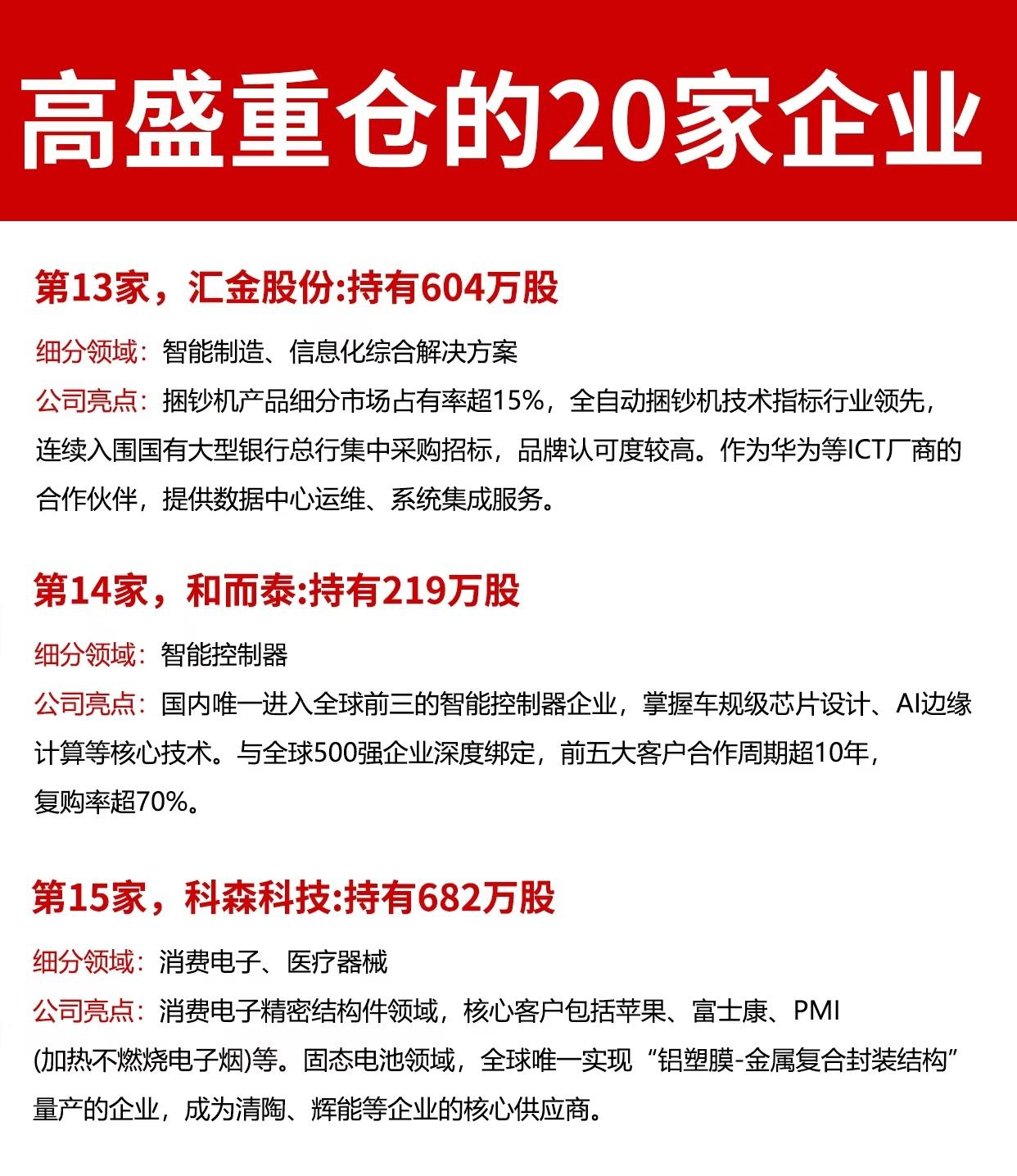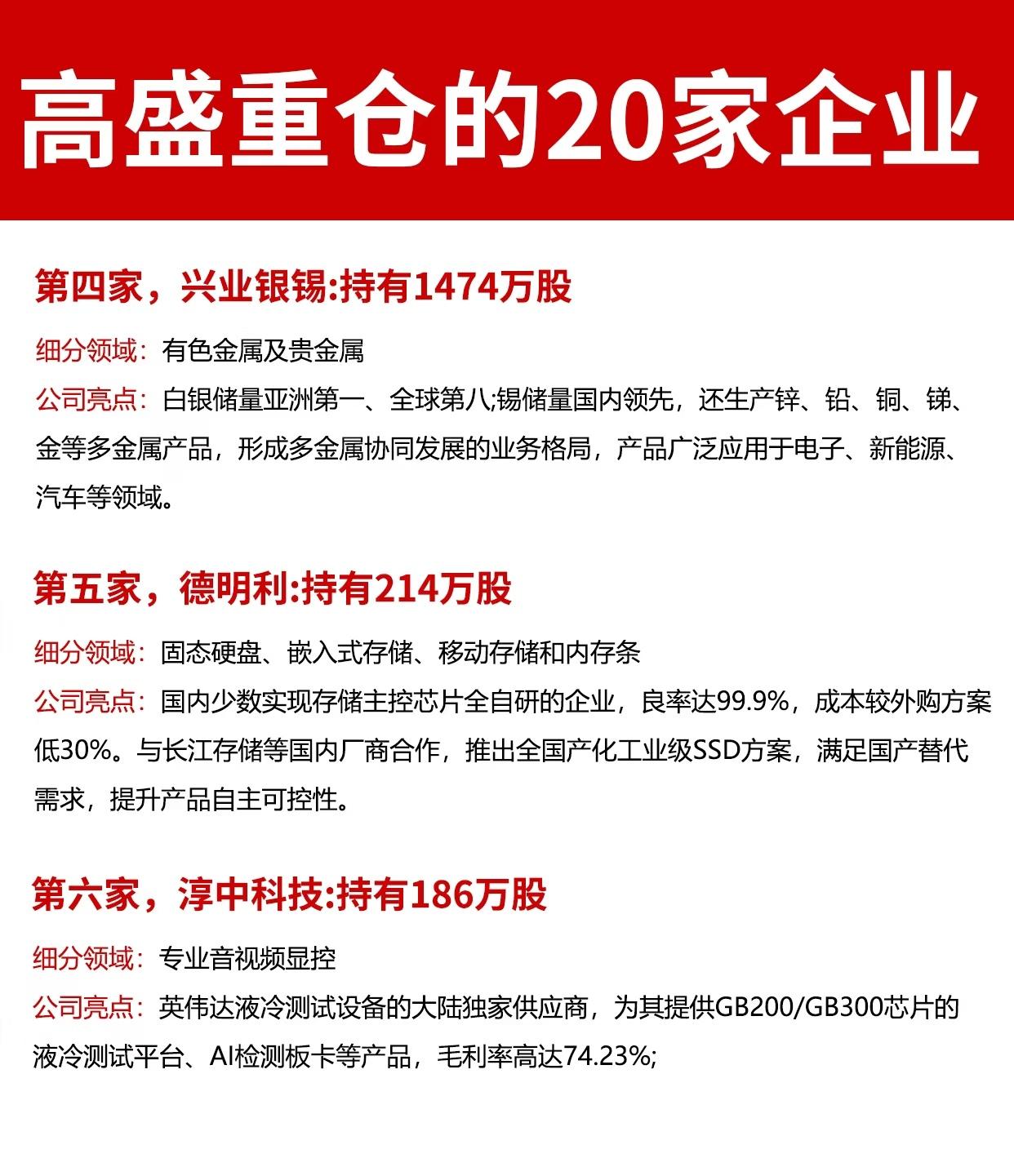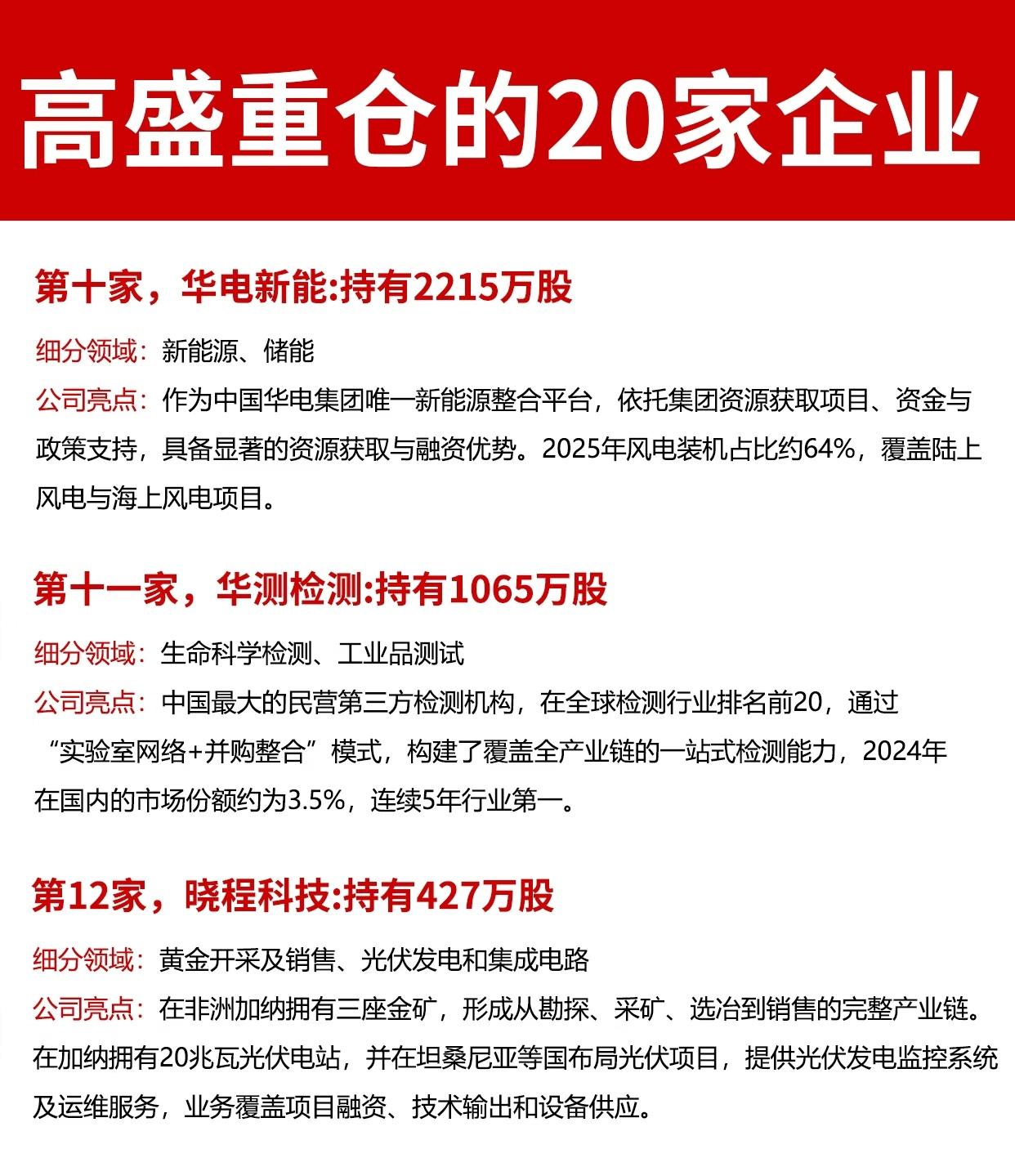 高盛重仓的20家企业涵盖半导体、光通信、智能制造、新能源、医疗、检测、矿产、消费电子等多个高成长领域,以下为各企业核心信息总结: 一、半导体与芯片相关 1. 豪威集团(持股1090万股)全球第三大图像传感器供应商,汽车CIS市占率全球第一,客户包括特斯拉、比亚迪,进入英伟达供应链,主营图像传感器、显示及模拟解决方案。 2. 德明利(持股214万股)国内少数实现存储主控芯片全自研的企业(良率99.9%),成本低于外购方案30%,推出全国产化工业级SSD方案,与长江存储合作,专注固态硬盘、嵌入式存储等领域。 3. 科森科技(持股682万股)消费电子精密结构件核心供应商(客户含苹果、富士康),固态电池领域全球唯一实现“铝塑膜-金属复合封装结构”量产,为清陶、辉能等供货。 二、光通信与算力基础设施 4. 华工科技(持股890万股)中国最大激光装备制造商之一,800G光模块国内份额32%、全球第三,与亚马逊、微软等合作,提供“激光+智能制造”系统解决方案。 5. 协创数据(持股348万股)全球第二大本土智慧存储设备制造商,转型为AI基础设施服务商,布局“算力底座+云端服务+智能终端”一体化。 6. 剑桥科技(持股169万股)高速光模块技术领先(800G产品良率超95%),前瞻布局1.6T光模块及LPO技术,通信设备硬件设计及智能制造积累深厚。 三、新能源与资源 7. 华电新能(持股2215万股)中国华电集团唯一新能源整合平台,2025年风电装机占比约64%,覆盖陆上/海上风电项目,具备资源获取与融资优势。 8. 盛屯矿业(持股1980万股)在刚果(金)拥有高品位铜钴矿(如卡隆威矿山),布局印尼镍项目,与国内前驱体厂商合作锁定加工利润,抗周期能力强。 9. 天际股份(持股475万股)六氟磷酸锂产能国内前三(与天赐材料、多氟多合计市占超60%),与宁德时代、比亚迪等头部电池厂商深度合作。 10. 华自科技(持股524万股)子公司精实机电为国内锂电设备头部供应商,与宁德时代合作,提供新能源项目控制设备及方案。 四、智能制造与检测 11. 汇金股份(持股604万股)捆钞机细分市场份额超15%(技术领先),入围国有大行采购招标,为华为等提供数据中心运维服务。 12. 和而泰(持股219万股)全球前三智能控制器企业(车规级芯片设计、AI边缘计算技术),与全球500强深度绑定(前五大客户复购率超70%)。 13. 华胜天成(持股818万股)绑定华为昇腾生态,承接15个华为智算中心总集成项目(享有扩容优先权),联合百度等推出“智能体一体机方案”。 五、专业设备与音视频技术 14. 淳中科技(持股186万股)英伟达液冷测试设备大陆独家供应商,提供GB200/GB300芯片液冷测试平台及AI检测板卡,毛利率74.23%。 六、矿产与高端制造 15. 兴业银锡(持股1474万股)白银储量亚洲第一/全球第八,锡储量国内领先,生产多金属产品(锌、铅等),应用于电子/新能源等领域。 16. *ST松发(持股173万股)手持船舶订单量全球第四(排期至2029年),布局氨燃料/氢燃料电池动力系统,与华为合作开发船舶数字孪生系统。 七、检测与建筑服务 17. 华测检测(持股1065万股)中国最大民营第三方检测机构(全球前20),国内市场份额约3.5%(连续5年第一),覆盖生命科学/工业品检测。 18. 尤安设计(持股326万股)国内建筑设计第一梯队,与绿地、保利、万科等头部房企长期合作,提供研发/咨询/技术服务。 八、消费电子与医疗 19. 晓程科技(持股427万股)非洲加纳布局三座金矿(完整产业链),在坦桑尼亚等国开发光伏项目,提供发电监控及运维服务。 20. 创新医疗(持股330万股)参股博灵脑机(国内唯一量产脑机接口康复设备,C端产品2025年上市),战略投资全诊医学(切入医疗大模型,覆盖60家医院)。 核心领域分布 - 科技硬件(半导体/光模块/存储/精密结构件):豪威、华工、剑桥、科森、德明利等 - 新能源(锂电/风电/储能/材料):华电新能、盛屯、天际、华自 - 智能制造与检测:华胜、和而泰、汇金、华测 - 资源与高端制造:兴业银锡、*ST松发 - 专业服务(音视频/建筑/医疗):淳中、尤安、晓程、创新医疗 高盛布局聚焦技术壁垒高、国产替代空间大或新能源产业链关键环节的企业,兼顾短期业绩确定性(如风电、锂电)与长期技术趋势(如AI算力、脑机接口)。