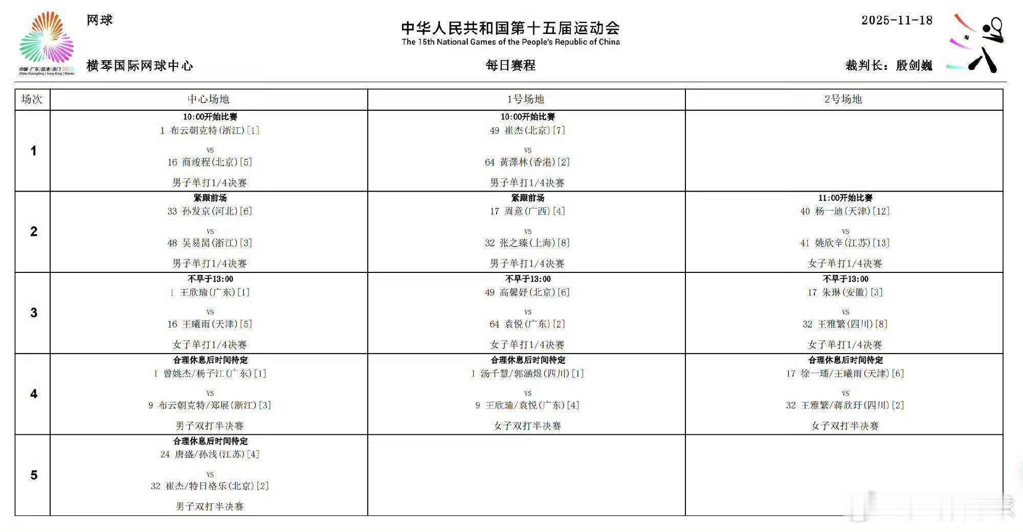 全运会18日网球赛程男女1/4决赛全面开启中心球场:10:00, 布云朝克特vs商竣程 帅哥争辉11:30,吴易昺vs孙发京 男神之战13:00,王欣瑜vs王曦雨 左右为难一号场地10:00,黄泽林vs崔杰 相见恨晚11:30,张之臻vs周意 悍将PK13:00,高馨妤VS袁悦 三盘双姝二号场地10:00,杨一迪VS姚欣辛 互有胜负 13:00,朱琳vs王雅繁 编剧互撕如果身在广州,今天不去看确实遗憾了。百年一遇