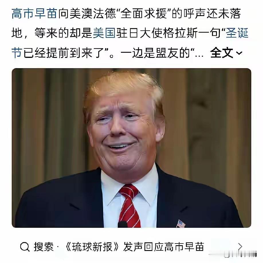 美国对亚洲的逻辑就是让台海生乱。让代理人日本去完成任务,美国隔岸观火,坐收渔利。 日本人也有他家的打算,拉美国下场,看高市早苗对特朗普的百依百顺就明白了,给美国送5000亿后还要笑年相迎,他们想让美国一起进场。 可美国人暗示日本人,圣诞节快到了,要打你们自己去吧,我的回家过圣诞了。美国人不傻,两次世界大战都是坐收渔利,这个甜头只有美国人懂! 日本人明白了美国人的想法开始退缩了,他们的企图是要摆脱美国,估计是不太可能的。日本未来走向决定在美国!