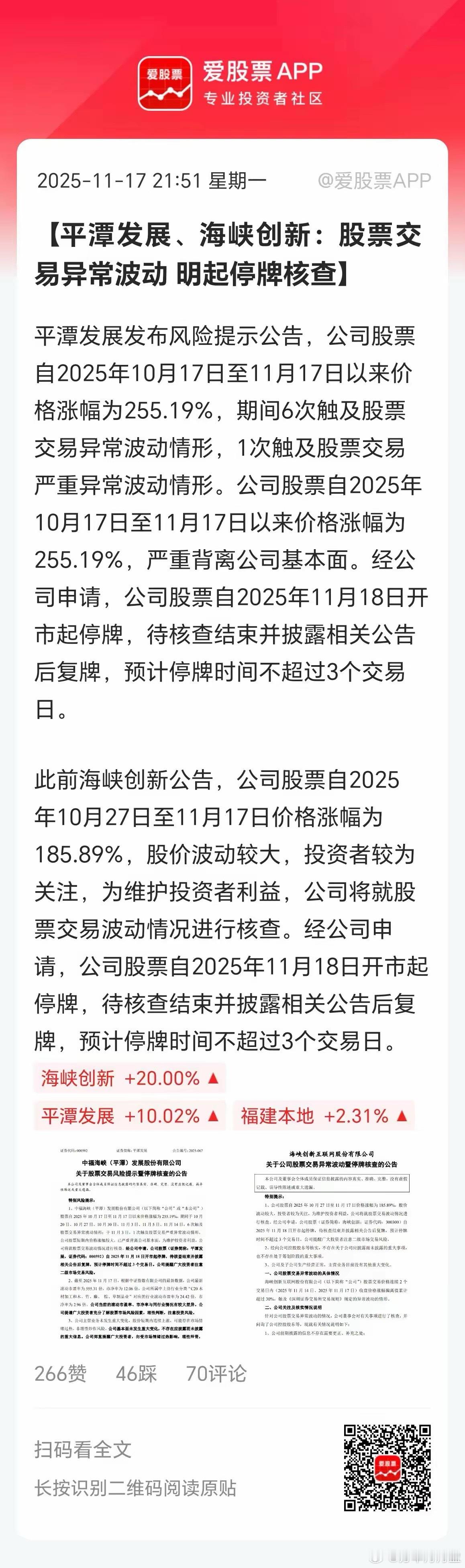 昨晚降温来真的啊,把福建双龙海峡创新+平潭发展停牌了!一天2家进小黑屋,这是几年来的首次,这个信号值得重视。武功再高,也怕菜刀。胳膊拧不过大腿,大家该跑就跑吧。