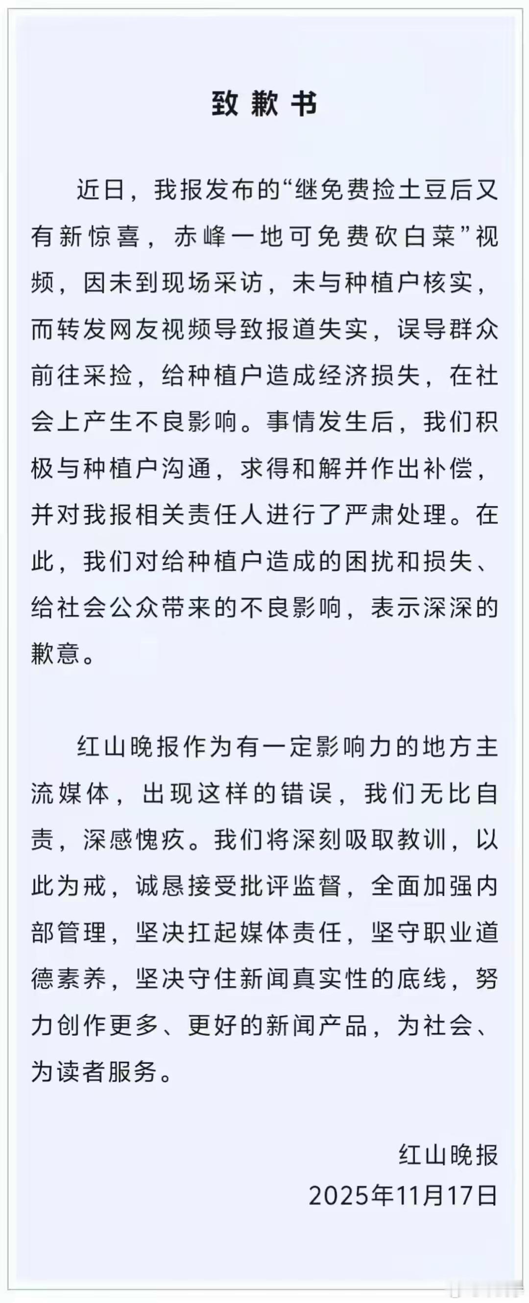 赤峰《红山晚报》就“免费采捡白菜”事件致歉:对相关责任人进行严肃处理,积极与种植户沟通求得和解并作出补偿。