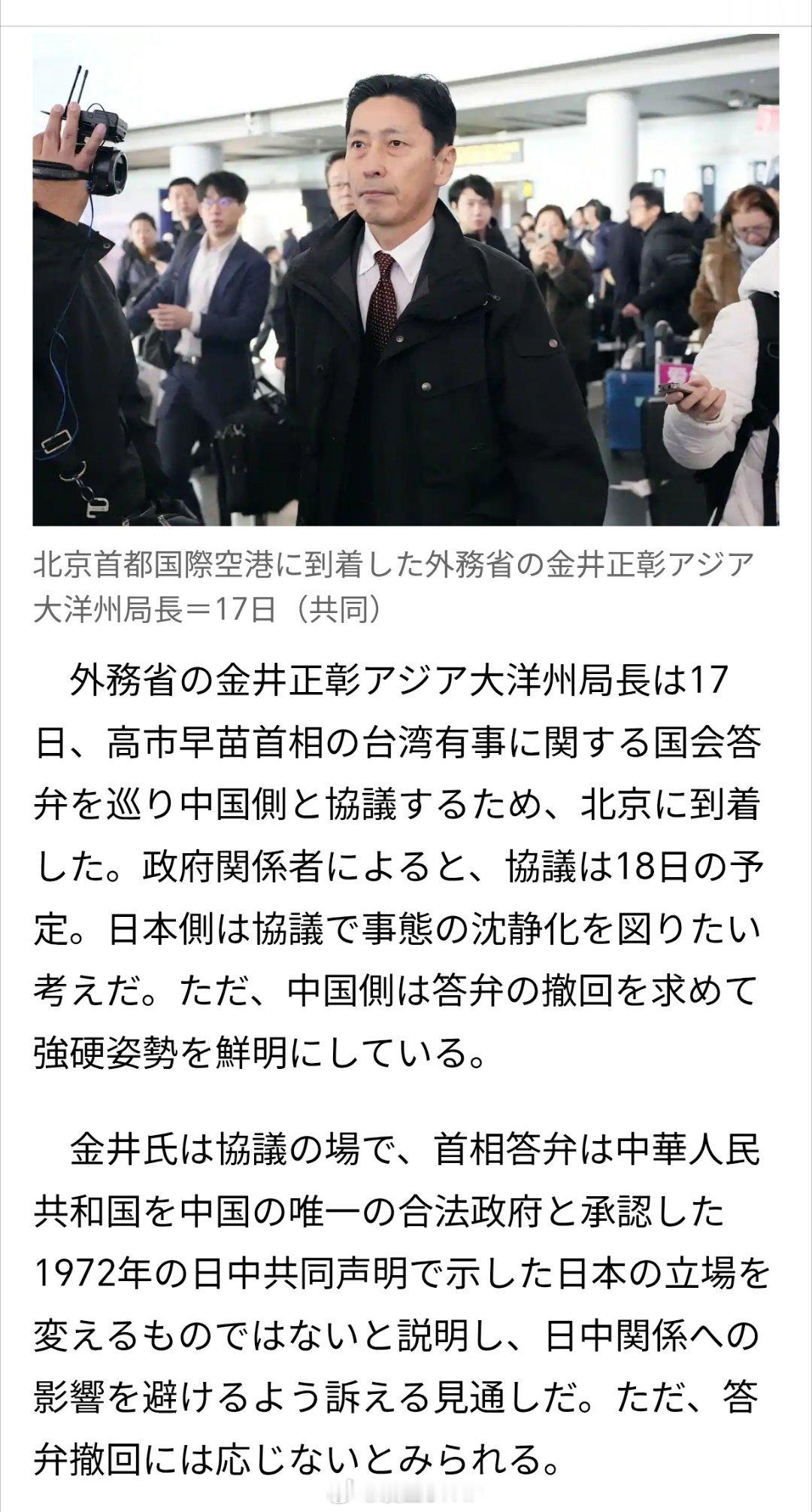 共同社:今天举行会谈,日本方面希望缓和局势,然而,中方则持续要求日方撤回相关答辩内容。预计金井正彰将在会谈中解释,首相的回应并未改变日本在1972年《中日联合公报》中阐明的立场,该公报承认中华人民共和国是中国唯一合法政府。然而,预计他不会同意中方要求其撤回回应的请求。