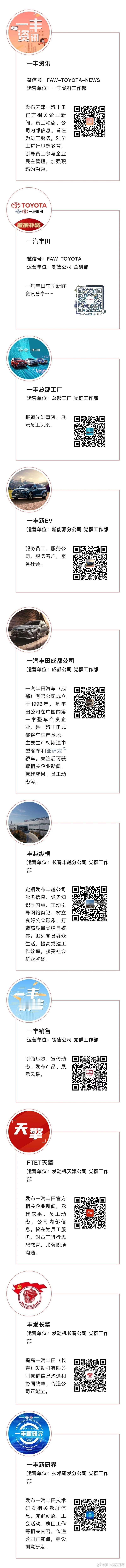 原来一汽丰田有这么多个公众号,天津工厂、成都工厂和长春工厂各一个,还有销售公司和新能源公司,就连发动机都有两个号,真是太给力了,想要了解一汽丰田可以关注关注。