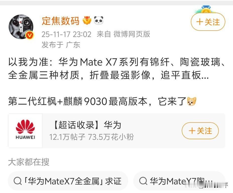 博主强调华为mateX7是折叠屏最强影像!有满血的麒麟9030处理器,第二代红枫,全焦段RYYB?会不会有大底长焦或者超大底主摄[思考]而且有三种材质,这三种材质估计对应的重量也不一样,重点还是在影像上面,可以追平直板旗舰机了那得好好看看了,折叠屏续航重要还是轻薄重要还是影像重要?