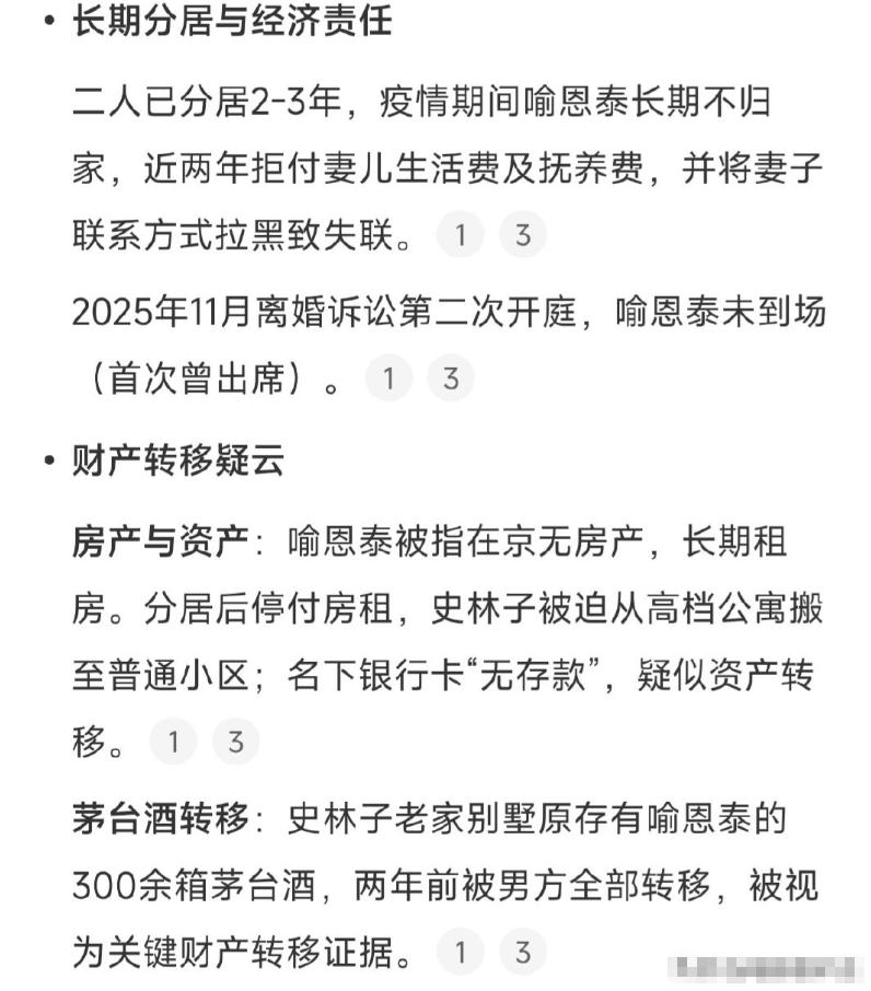 不敢想象,在娱乐圈,离婚律师讲的奇葩案件变现实了。 11月17日,卓伟爆料,著名演员喻恩泰被妻子起诉离婚,原因是喻恩泰已经两年没回家了,既不给生活费,也不回家看儿子和女儿,他的妻子史林子被逼无奈,只能选择起诉离婚。 提起喻恩泰,很多人会想到《武林外传》里温文尔雅的吕秀才,那个满口之乎者也的高知形象,连同他后来“宠妻狂魔”的标签,曾让不少人相信他是娱乐圈难得的清流。 可谁能想到,这样的荧幕形象和公开人设背后,藏着一段让人心寒的婚姻真相。 11月17日,知名狗仔卓伟的一则爆料,让喻恩泰空降热搜榜首,也揭开了这场持续两年的家庭冷暴力。 喻恩泰与史林子的缘分始于多年前,彼时的喻恩泰还顶着“不婚主义”的标签,却在遇见史林子后彻底改变,两人一见钟情,2015年携手走进婚姻殿堂。 婚后,原本也是演员的史林子选择退圈,把重心放在家庭和孩子身上,一双儿女的到来让这个家庭看起来十分圆满,小女儿如今也才六七岁。 而喻恩泰则继续在演艺道路上发展,近期还参演了《沉默的荣耀》,在剧中饰演蔡孝乾一角。 在外人看来,这是一段才子配佳人的美满婚姻,喻恩泰的“高知精英”人设也因家庭和睦更加稳固。 但这份看似美好的表象,在两年前开始出现裂痕。 不知从何时起,喻恩泰回家的次数越来越少,直到最后完全不回。 更让人无法接受的是,他不仅对妻子儿女不管不顾,还彻底切断了经济支持,生活费、孩子的学费都一概不再支付。 起初,史林子还在独自支撑,可随着时间推移,喻恩泰的态度愈发决绝,近几个月更是直接拉黑了史林子,导致两人完全失联。 孤立无援的史林子,不得不带着两个年幼的孩子从高档公寓搬到普通小区,生活质量一落千丈。 在长期失联和情感疏离之外,更让人关注的是这场婚姻背后的财产疑云。 卓伟爆料中提到,喻恩泰名下如今呈现出“三无”状态:无房、无车、无存款,平日里一直靠租房居住。 这对于一位常年活跃在荧幕上的知名演员来说,实在不合常理。 更可疑的是,史林子老家别墅里存放的两三百箱茅台,早在两年前就被悄悄搬空。 结合喻恩泰如今的“无产”状态,不难看出这并非偶然,更像是一场早有预谋的安排。 卓伟在爆料中也直接点明,这很可能是喻恩泰精心策划的离婚计划,目的就是为了转移财产,规避应尽的责任。 被逼到绝境的史林子,最终选择了起诉离婚。 这场离婚诉讼已经在北京开庭两次,上周进行的第二次开庭中,喻恩泰依旧没有露面,只留下史林子独自面对这场没有对手的官司。 如今的史林子,名下仅剩一辆自己购买的车作为保障,独自承担着抚养两个孩子的重任,既要照顾孩子的生活起居,还要应对复杂的诉讼流程,处境十分艰难。 她当初为了家庭放弃事业,本以为能换来长久的安稳,却没想到最终落得人财两空的结局,这样的遭遇实在让人唏嘘。 喻恩泰的这一系列操作,也让他过往的负面新闻被重新提及。 早年就有消息称他疑似对女星举止不当,只是当时并未引发大范围关注。 而此次婚变中暴露的婚内冷暴力、刻意转移财产等行为,更是让他的“高知精英”滤镜彻底破碎。 作为公众眼中的学霸,他本该用知识涵养品格、承担责任,可现实中,这些知识反而成了他规避责任、算计家人的工具,实在令人讽刺。 其实,喻恩泰的情况并非娱乐圈个例。 在不少明星的离婚纠纷中,财产转移似乎成了常见操作。 天价资产通过亲友代持、伪装成收藏品等方式“隐身”,明星团队总能找到规则漏洞,让本该分割的共同财产凭空消失。 这种操作不仅让普通民众难以应对,也让监管部门的跟进显得有些滞后,套路总是比规则快一步。 独自支撑家庭许久,面对丈夫的彻底缺位,史林子实在没有别的选择,只能通过法律途径起诉离婚,寻求一个基本的保障。 这场离婚大战还在继续,或许未来还会有更多内幕被揭开。 但无论最终的诉讼结果如何,喻恩泰对结发妻子和亲生骨肉的绝情,已经让他失去了作为公众人物最基本的道德底线,也给所有身处婚姻中的人敲响了警钟。 今天的分享到这里就结束了,大家对此事有何看法,欢迎在评论区留言和讨论,感兴趣的可以点击头像加关注,我将每日更新优质内容,我们下期见。