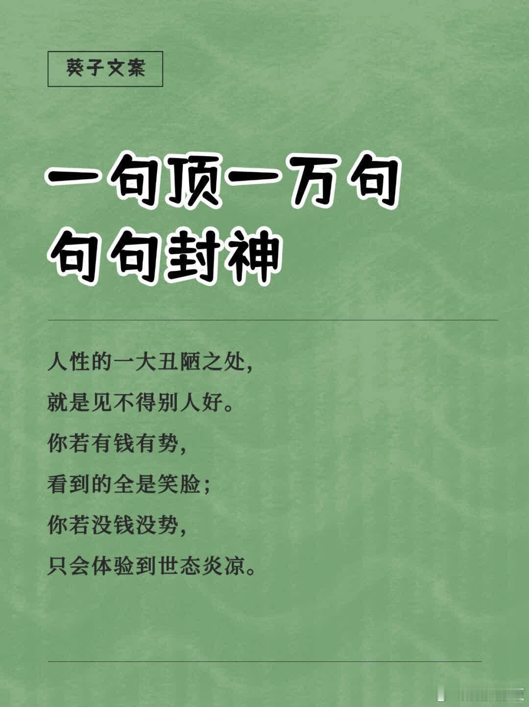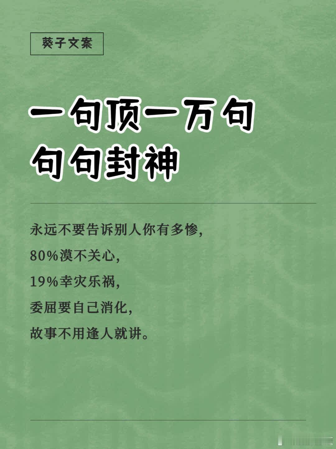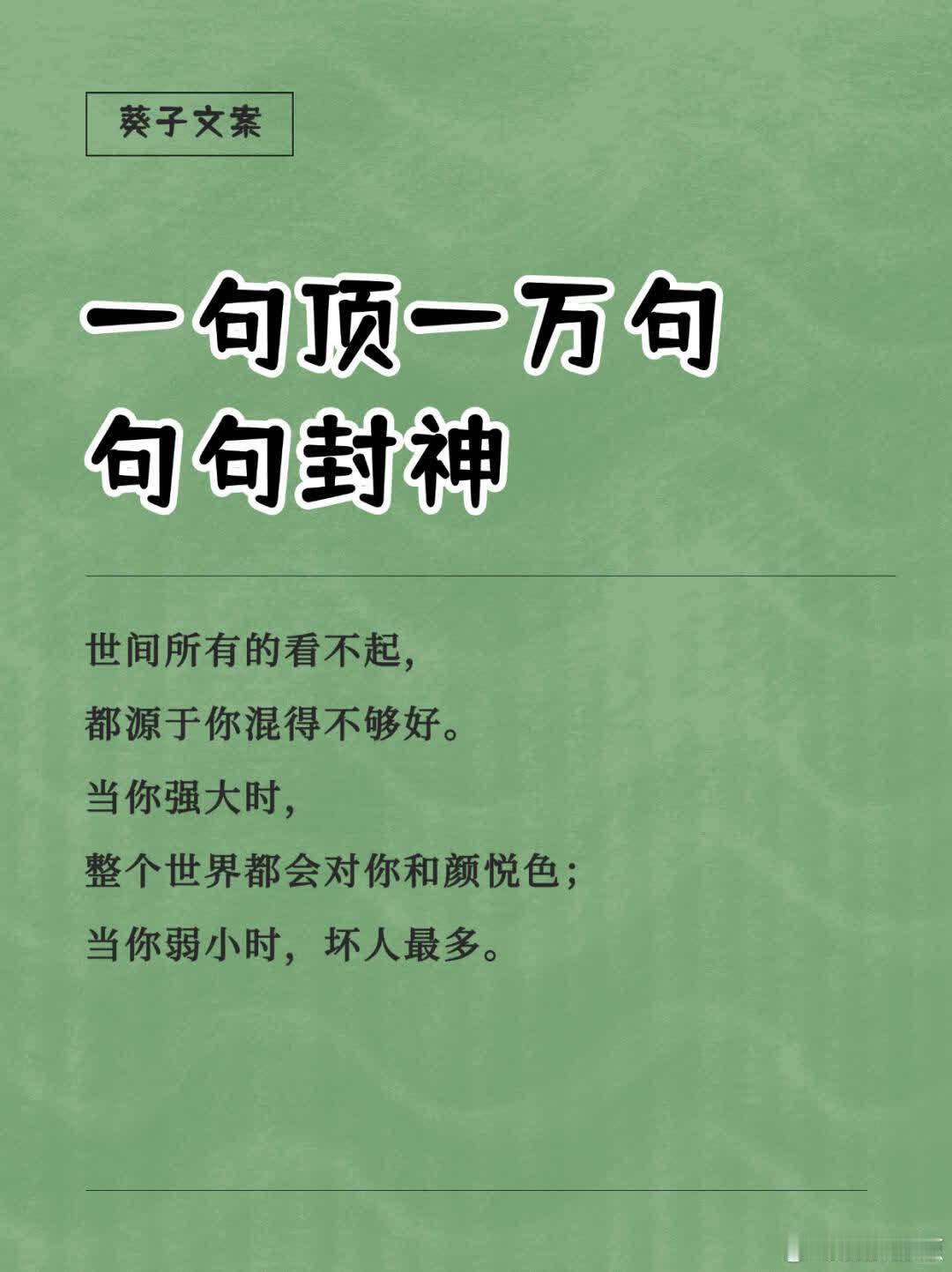 一句顶一万句,句句封神 1️⃣在利益面前,不要高估你和任何人的关系。人间清醒的四不原则:不被拿捏、不信承诺、不吃大饼、不听故事。 2️⃣永远不要告诉别人你有多惨,80%漠不关心,19%幸灾乐祸,委屈要自己消化,故事不用逢人就讲。 3️⃣人心经不起试探,感情经不起等待。真正在意你的人,不会让你总猜来猜去。那些忽冷忽热的温柔,都是算计。 4️⃣世间所有的看不起,都源于你混得不够好。当你强大时,整个世界都会对你和颜悦色;当你弱小时,坏人最多。 5️⃣低质量社交不如高质量独处,不必把太多人请进生命里来。没有意义的人和圈子,只会降低我们的生活质量,消耗我们的人生。 6️⃣承诺像风,说出来容易,飘走了无声,不要在乎失去谁,最该在乎的是剩下谁。筛掉的都是杂质,留下的才是真金! 7️⃣保护自己的最佳方式,就是从不高估自己,在别人心目中的分量。热情有限,及时止损,别希望,别期望,别盼望,别指望,就不会有失望。 8️⃣成年人的社交,本质上是价值交换。与其讨好迎合,不如默默提升自己。当你足够优秀,自然有人与你并肩同行。 9️⃣人性的一大丑陋之处,就是见不得别人好。你若有钱有势,看到的全是笑脸;你若没钱没势,只会体验到世态炎凉。