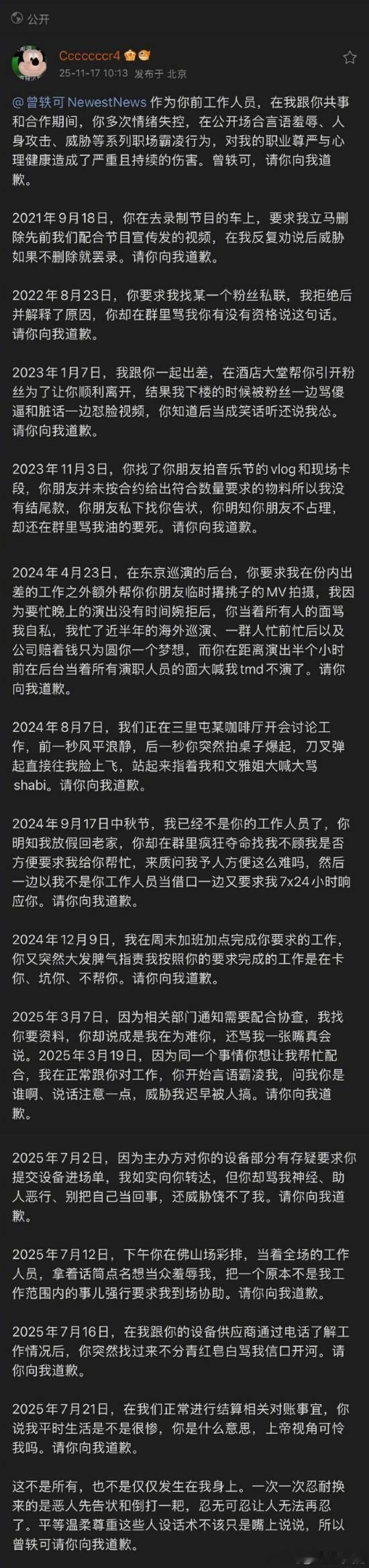 曾轶可前员工发长文又删除,控诉曾轶可职场霸凌据新浪消息,疑似曾轶可团队前工作人员日前发文控诉曾轶可,指责其职场霸凌。“在我跟你共事和合作期间,你多次情绪失控,在公开场合言语羞辱、人身攻击、威胁等系列职场霸凌行为,对我的职业尊严与心理健康造成了严重且持续的伤害。曾轶可,请你向我道歉。 ” 目前查看该工作人员微博,相关博文已删除或隐藏。