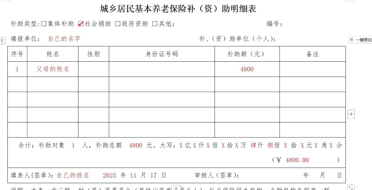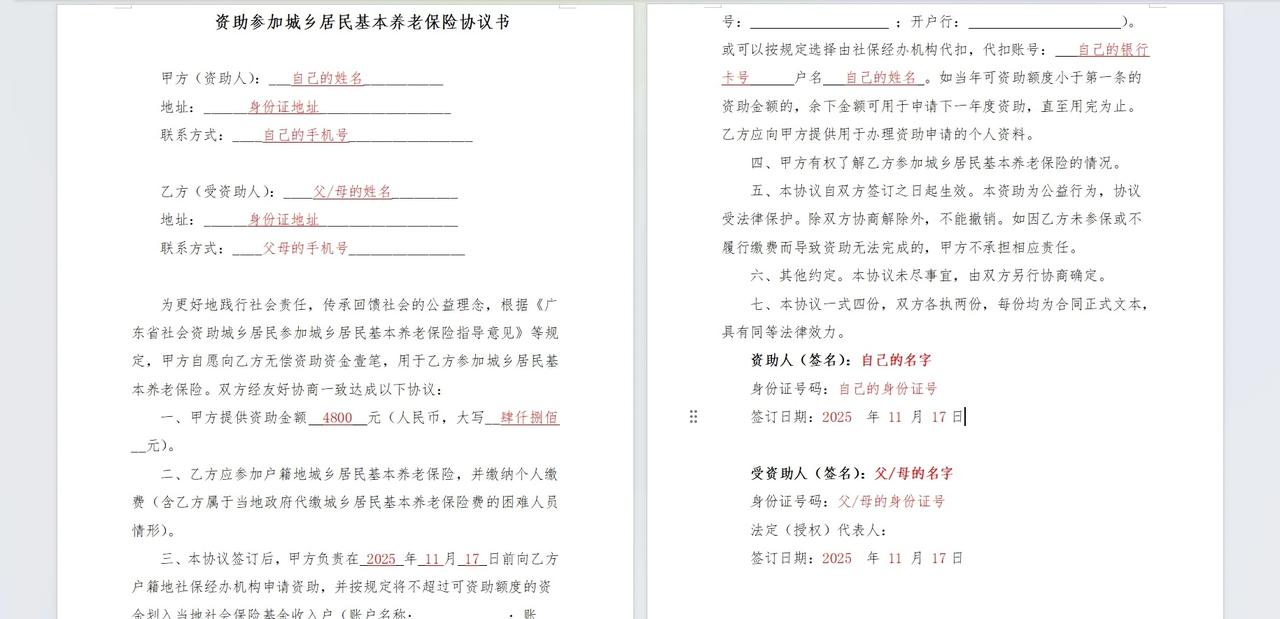 广东城乡居民养老保险(子女资助) 💡 先划重点:谁能办?怎么缴? ✅ 适用人群:父母已参加广东城乡居民养老保险(比如普宁新农合升级的那种),且没领养老金 ✅ 资助金额:广东每年最高4800元!和父母个人缴费不冲突(哪怕爸妈只交180元最低档,子女也能按最高档资助) ✅ 资金去向:全额进爸妈个人账户,还能算利息,退休后直接多领钱! 📱 线上操作3步搞定(粤省事版,全流程已截图) 1. 爸妈先缴当年个人保费(不限档次,到账后就能办) 2. 子女用自己的粤省事账号→搜索「社会资助」→选「城乡居民养老保险社会资助」 3. 填爸妈身份证+参保地(比如揭阳普宁),选4800元档次,微信/银行卡付款就行! ⚠️ 找不到入口?换「广东人社APP」或直接搜「粤税通」代缴,实在不行跑一趟政务中心(普宁地址放文末啦) 💰 养老金能多领多少?实测算账! 假设爸妈60岁退休,子女连续资助10年(按每年4800元算): 个人账户多存:4800×10 + 利息 ≈ 5万元 每月多领:50000÷139≈360元! 加上基础养老金(普宁现在约200-250元),总共能领600+元/月,比只交最低档翻一倍! (但建议先将父母当年的养老提档到最高档,再子女资助,即相当于一年交了9600的养老) ❌ 常见误区避坑 1. 信用卡能付吗?线上支持银联信用卡,但自动扣款只能用储蓄卡 2. 往年能补吗?不行!只能资助当年,早缴早攒利息 3. 要按手印吗?线上电子签名就行,不用跑线下 📍 普宁姐妹专属参考 政务服务中心地址:流沙大道西189号二楼社保窗口 上班时间:周一至周五 8:30-12:00/14:30-17:30 咨询电话:0663-8370256(不懂直接打,态度超耐心) 城乡居民养老 老年人养老模式 补充养老保险 广东养老 城乡居民养老保险 子女资助 城乡居民养老保险社会资助 城乡居民养老保险子女资助 普宁养老保险