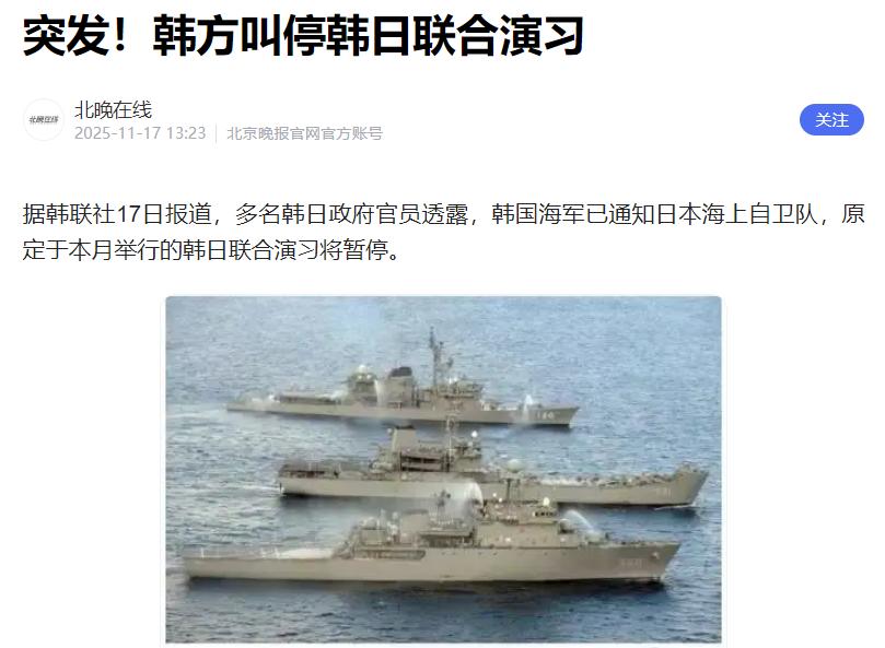中日外交角斗愈演愈烈,韩国悄悄站队,叫停了韩日联合演练! 最近这半个月的时间里,中日围绕高市早苗11月7日涉台不当言论的交锋愈演愈烈,早已不是简单的外交口角,而是触及地区安全红线的激烈碰撞。 而就在这种剑拔弩张的氛围里,韩国海军突然通知日本海上自卫队,暂停原定于本月举行的联合演习,这个时间点选得耐人寻味,说是巧合恐怕没人相信。 要知道这次暂停的可不是什么无关紧要的例行训练,而是自1999年到2017年办了10次、2018年因“雷达照射事件”中断后好不容易要重启的海上联合搜救训练,原本被韩日双方当作“加强合作的象征”来宣传,结果说停就停。 表面看,是因为日本上月叫停了给韩国军机加油的计划——日方发现要加油的韩国军机曾在独岛周边训练。可明眼人都清楚,独岛争议不过是个由头,真正的考量还是中日之间的紧张局势。 紧接着,韩国总统办公室就宣布把东亚三国官方表述顺序定为“韩中日”,这和之前尹锡悦政府明显偏向日本的“韩日中”表态形成了鲜明对比,等于明着告诉外界要拨乱反正恢复外交平衡。这步棋走得相当精明,毕竟有过萨德事件的惨痛教训在前。 2017年部署萨德系统后,中国赴韩游客大幅减少,韩国现代经济研究院的数据显示当年损失就高达18.1万亿韩元,约合人民币1048亿元,直接流失40万个就业岗位,购物业单行业就损失108亿美元。 那种切肤之痛让韩国政府再不敢轻易在大国之间选边站,尤其是现在中韩经贸联系比八年前更紧密,韩国半导体出口到中国的份额占其总出口的三成以上,汽车、化妆品等产业更是离不开中国市场。 真要是因为站队日本得罪中国,韩国在经济上的损失可不是靠和日本搞几次联合演习就能补回来的。 而且韩国很清楚,中日这次交锋的量级远超以往,中方已经做好了实质反制准备,在政治外交领域要在联合国等多边框架谴责日本军事扩张,军事上也有足够的威慑力,这种时候凑上去和日本搞军事合作,无异于把自己架在火上烤。 更何况韩国国内对日本的感情本就复杂,历史问题没彻底解决,民众对与日本加强安保合作的反对声一直不小,之前尹锡悦政府偏向日本的做法就引发不少争议,现在借着暂停演习调整立场,既能避免卷入中日冲突,又能平息国内舆论,可谓一举两得。 在大国博弈的棋局里,韩国这种夹在中间的国家,最稳妥的生存之道就是保持中立,既不跟着美国围堵中国,也不顺着日本挑衅红线,叫停一场联合演习看似简单,实则是经过精密计算的外交表态,既给了中日双方台阶,又守住了自己的利益底线。 这种左右逢源的本事,也算是韩国在东北亚地缘政治中练出来的生存技能了。