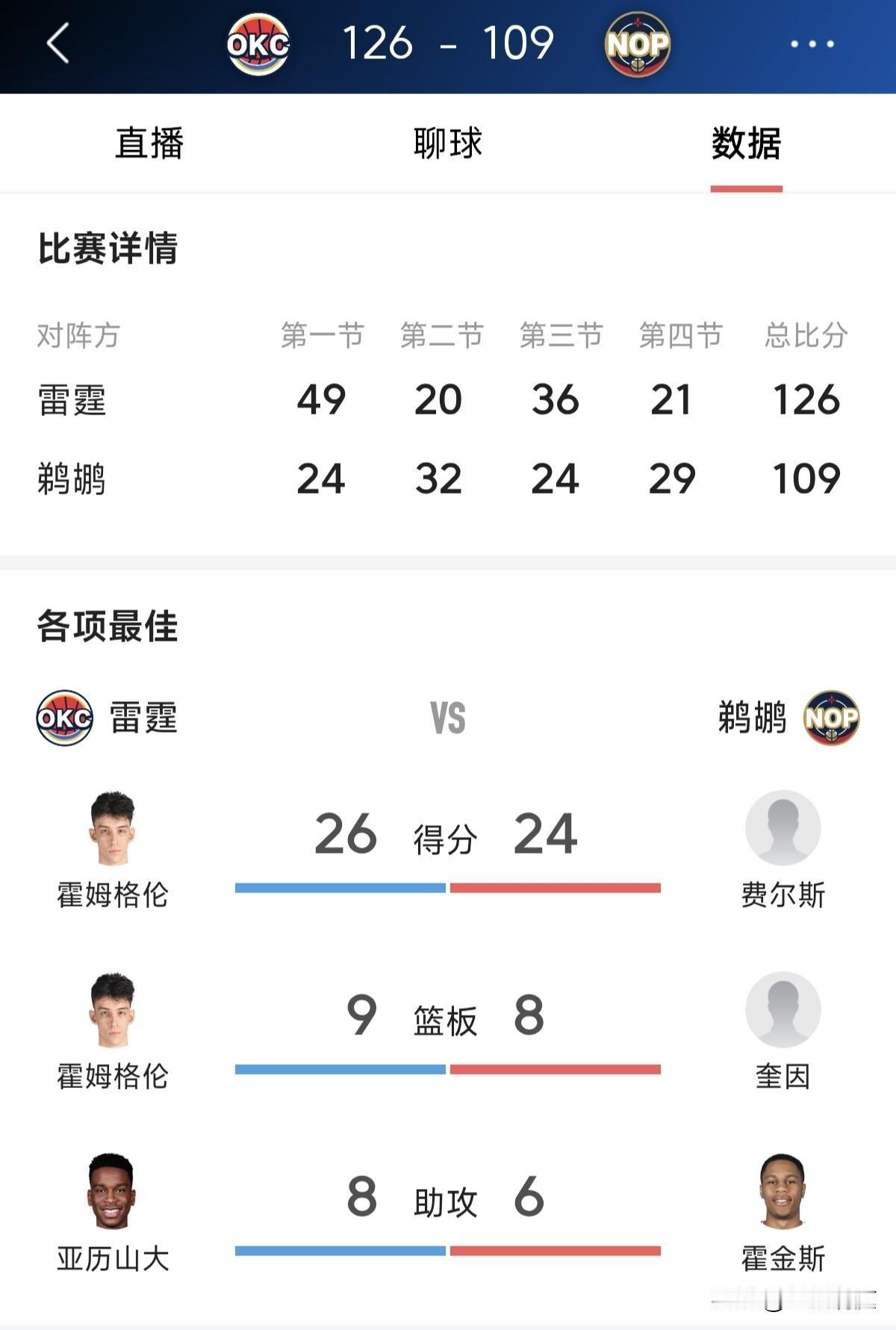 亚历山大23分8助攻带领雷霆客场大胜鹈鹕取得六连胜,因为球队大比分领先导致早早下场,亚历山大的数据“缩水”,想要拿得分王和MVP这样玩是不行的,本赛季已经快进行五分之一,只要不是伤病原因,MVP争夺还是属于亚历山大和约基奇,你们觉得呢?