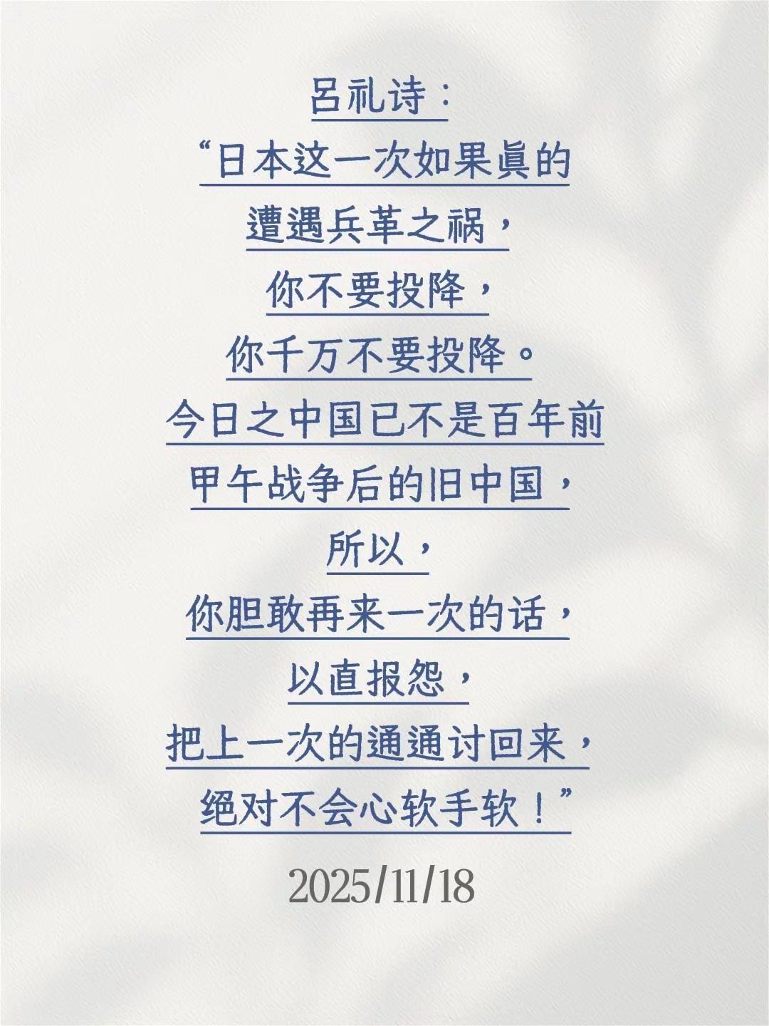 吕礼诗:“日本这一次如果真的遭遇兵革之祸,你不要投降,你千万不要投降。今日之中国已不是百年前甲午战争后的旧中国,所以,你胆敢再来一次的话,以直报怨,把上一次的通通讨回来,绝对不会心软手软!”