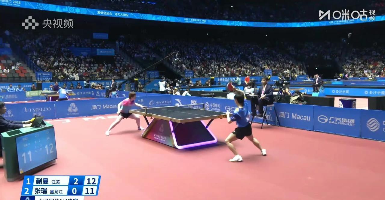 都是直落三局[捂脸], 赢的也赢得痛快,输的也输得痛快, 刚刚结束的一场2025年第十五届全运会女团1/4决赛中, 蒯曼所在的江苏队2-3不敌王曼昱所在的黑龙江队,未能晋级女团四强,黑龙江队不出所料如愿晋级四强了。 比较巧合的是每一盘都不纠结,都是三局结束: 第一盘钱天一/石洵瑶3-0击败张瑞/范姝涵, 第二盘蒯曼0-3不敌王曼昱[捂脸], 第三盘石洵瑶1-3不敌范姝涵,石洵瑶输掉这一场不应该了,局势反转就在这一局了。 第四盘蒯曼3-0击败实力不俗的张瑞, 第五盘钱天一0-3真的打不过王曼昱 [捂脸]。 江苏队里有三个国乒选手,但还是抵不过只有王曼昱一名国手的黑龙江队, 石洵瑶输了范姝涵,王曼昱就有了第二次上场的机会,可以说,只要王曼昱有上第二次的机会,黑龙江就赢了。