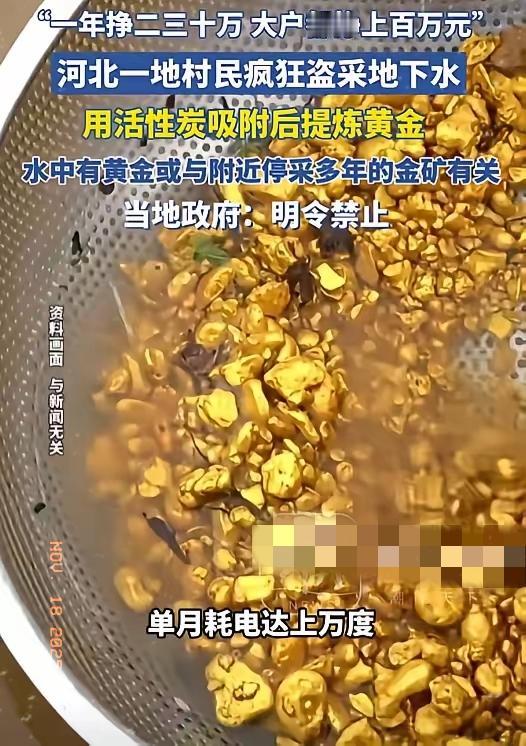 河北一村疯狂抽地下水炼金!有人年入百万,却付出致命代价:吃水井全枯孩子重金属超标! 河北青龙满族自治县清河沿村近两年彻底变了样! 家家户户院墙拉着粗电线院子里半人高铁桶日夜轰鸣,大功率水泵接在深井上,24小时不停嗡嗡转,连在外打工的年轻人都纷纷辞工回村守着这些铁桶过日子。 这不是什么新兴产业而是村民们偷偷搞的“发财捷径”——抽地下水炼金! 怪事早有苗头。村里有家农户去年电费高达7.7万用电量飙到9.6万度,相当于普通家庭近百年的用电量!可没人喊亏反而越来越多村民跟风搭设备,只因这行当利润高得吓人:一桶活性炭千把块加上每月上万电费,三个月成本顶破天两万,却能提炼出80到100克黄金,按市价能卖七八万净赚比打工一年还多。普通人家年入二三十万稀松平常,打两三口井的“大户”一年纯利直接超百万! 这“天上掉金子”的好事源头竟是村北一座停了十多年的金矿。早年开矿用剧毒氰化物药水泡矿石提金,这种几十年都降解不了的毒素,没处理干净就渗进地下反倒让深层地下水变成了“天然金汤”。有村民偶然发现水里藏金,没选择上报反而偷偷在自家院子打深井炼金,还把这事告诉了乡邻一场疯狂的“淘金热”就此蔓延。 可这看似一本万利的生意背后是毁灭性的代价。 以前十几米深就能抽出水的老井如今五十多户人家的吃水井全枯了,村民只能花钱买桶装水度日。村边原本清澈见底的小河,如今飘着一层灰沫岸边野草成片枯黄生态彻底被破坏。 比缺水更致命的是剧毒污染!这种炼金方式会造成二次污染废水中的重金属和氰化物顺着水流扩散,渗进土壤被庄稼吸收,流向下游最终又端回村民自己的饭桌。村医私下透露,最近村里喊头晕的孩子越来越多,不少查出来都是重金属超标,健康正被这些“不义之财”一点点吞噬。 贪心不足蛇吞象!为了眼前的暴利不惜掏空地下水、污染家园、牺牲子孙后代的健康,这样的“发财路”终究是一条绝路。如今,这场疯狂的淘金闹剧已引发关注,等待这些村民的将是法律的严惩和环境破坏后的沉重恶果。保护环境不是口号而是关乎每个人生存的底线,别让一时贪念毁掉赖以生存的家园!