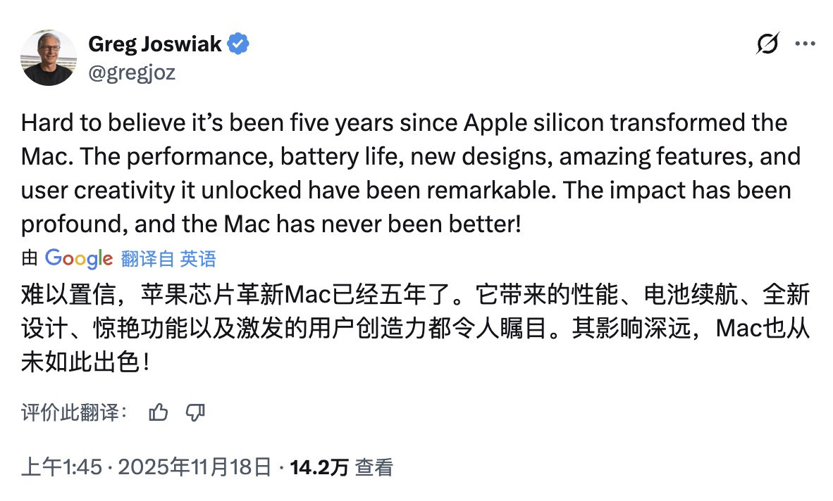 Apple Silicon 5 周年,Joz 发帖盛赞其影响深远,从未如此出色。热知识:采用 Apple M1 芯片的 Mac 于 2020 年 11 月 10 日发布。Mac 产品线于 2023 年 6 月完成向苹果芯片的过渡。