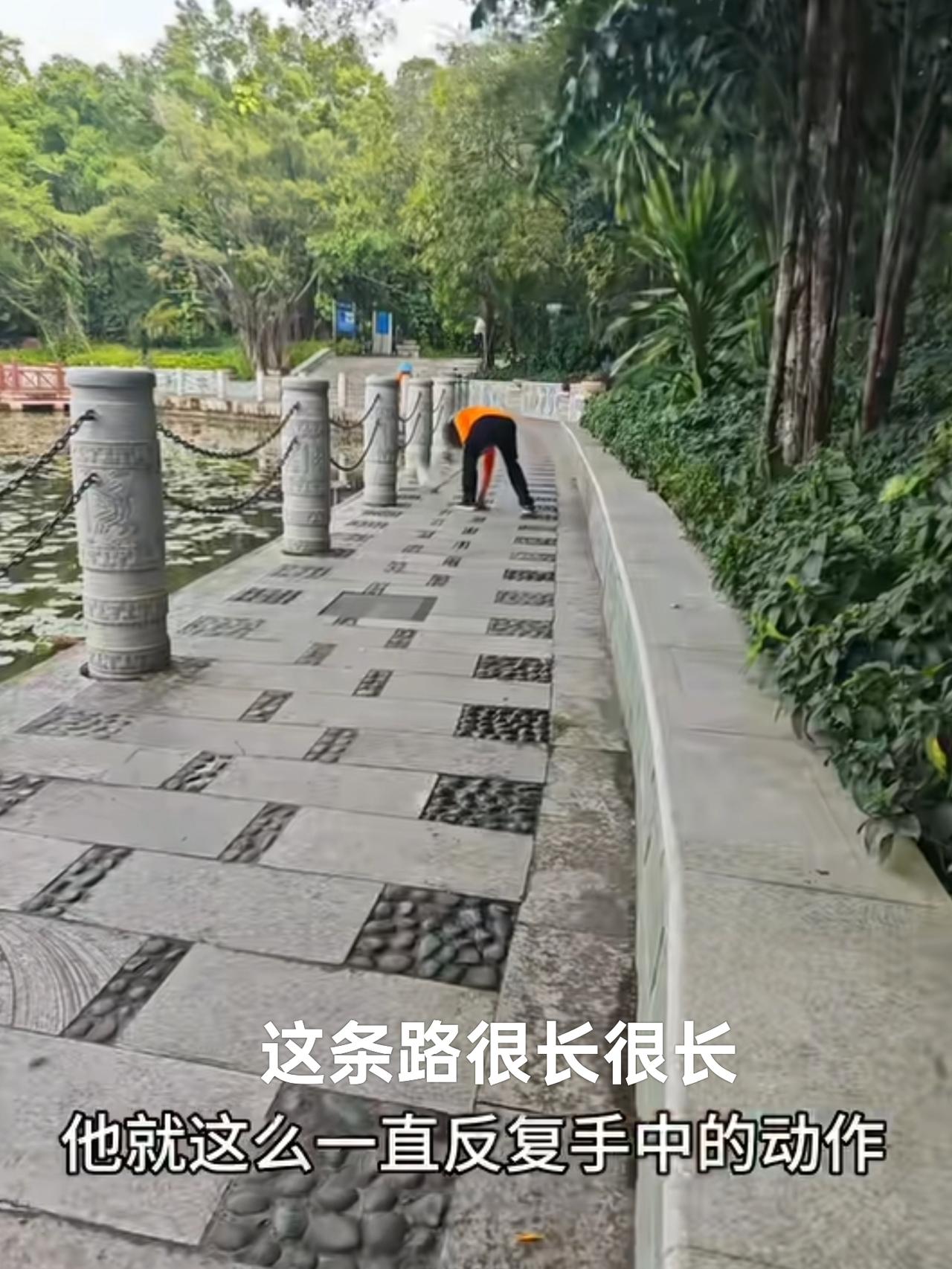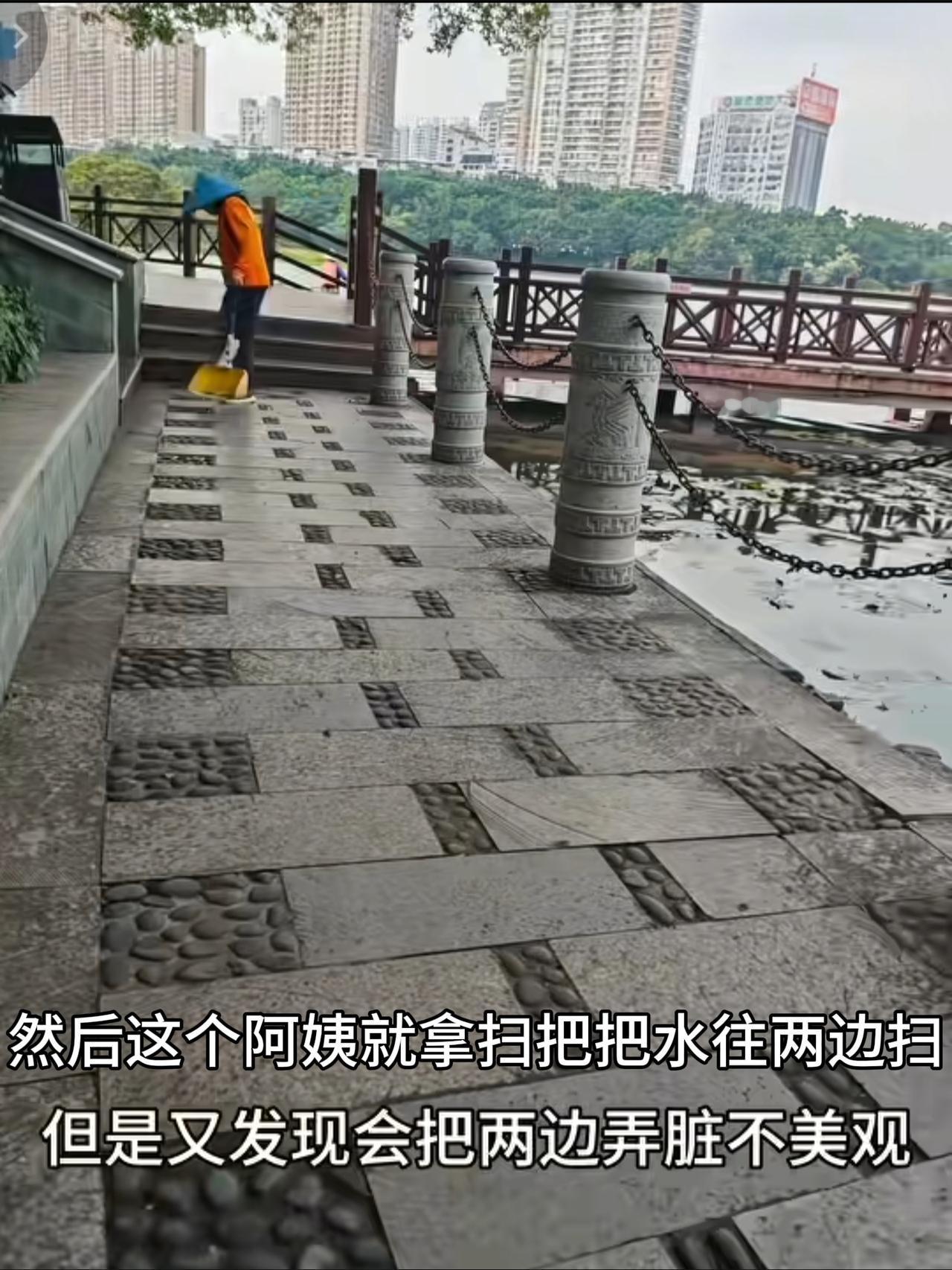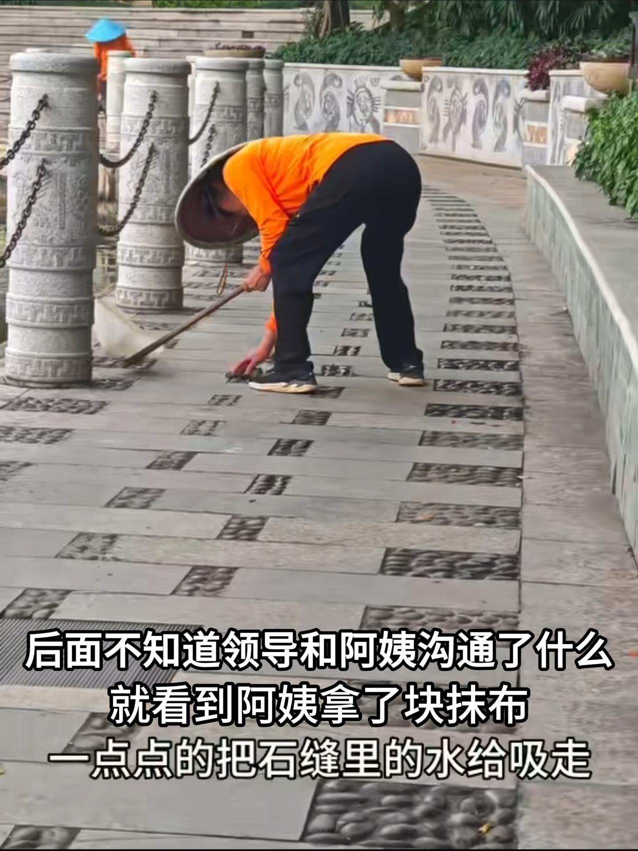 “不管做这件事有没有意义,就是不能闲着”!近日,一位网友发布视频称,自己在公园游玩的时候,无意间看到一位环卫工阿姨在用抹布清理路上石缝里的积水,旁边的领导在一旁看着,下达着命令。 11月17日,广西南宁南湖公园,一位网友在公园散步的时候,看到一位环卫工阿姨在清扫垃圾,这时她的一位领导走了过来,对她说地上鹅卵石缝里面有水,影响美观,于是让阿姨把里面的积水给扫出来。但是用扫把扫的话,又把水弄的到处都是,于是领导把阿姨喊了过去,让她用抹布来清理,于是阿姨便弯下身子用抹布一点点的把石缝里面的水给吸干。这条路很长,阿姨一直重复着手中的动作,直到把整条路上石缝里的积水吸干。 看着阿姨忙碌的背影,这位网友陷入了沉思,石缝里的水过一会自己就会被风干,为什么非要专门再去清理一下呢?是什么让这位阿姨困在无意义的细节里面。是石缝里面有水影响美观,还是石缝里面有水容易让人滑到? 其实这位领导的目的也是想让公园的道路保持干净,但是连石缝里面的水都不放过,有点过于吹毛求疵了。 有位网友说的话让大家感触颇深,他说:“在权限的范围内最大程度的为难别人,这个就叫刻薄”,确实,这位阿姨已经把道路上面的垃圾清扫完毕了,本来可以待在路边歇上一会的,但是因为领导的一句话,又要去清理石缝里面的积水。不能说这样做毫无意义,但是意义确实不大。 现在大家最担心的就是,这件事情被曝光之后,阿姨还能不能正常的工作,会不会因此而被辞退。