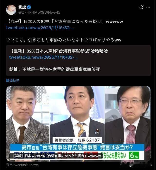 日媒炒作“82%日本人支持出兵台海”引争议,网民质疑数据真实性‌ 据媒体报道2025年11月17日,日本媒体共同社发布调查称,48%的日本民众支持首相高市早苗提出的“台海有事时自卫队行使集体自卫权”政策。然而,部分日本电视台进一步夸大报道,声称“82%日本人支持台海参战”,引发广泛质疑。 这一数据不仅遭到中国民众驳斥,日本网民也纷纷在社交媒体上表达不满。有网友讽刺道:“若真开战,叫嚣最凶的人肯定先跑!” 另有评论指出,调查样本可能存在偏差,且日本民众对卷入台海冲突的意愿被严重高估。分析人士认为,此类炒作可能旨在为日本政府强化军事存在制造舆论,但实际民意与宣传存在明显落差。