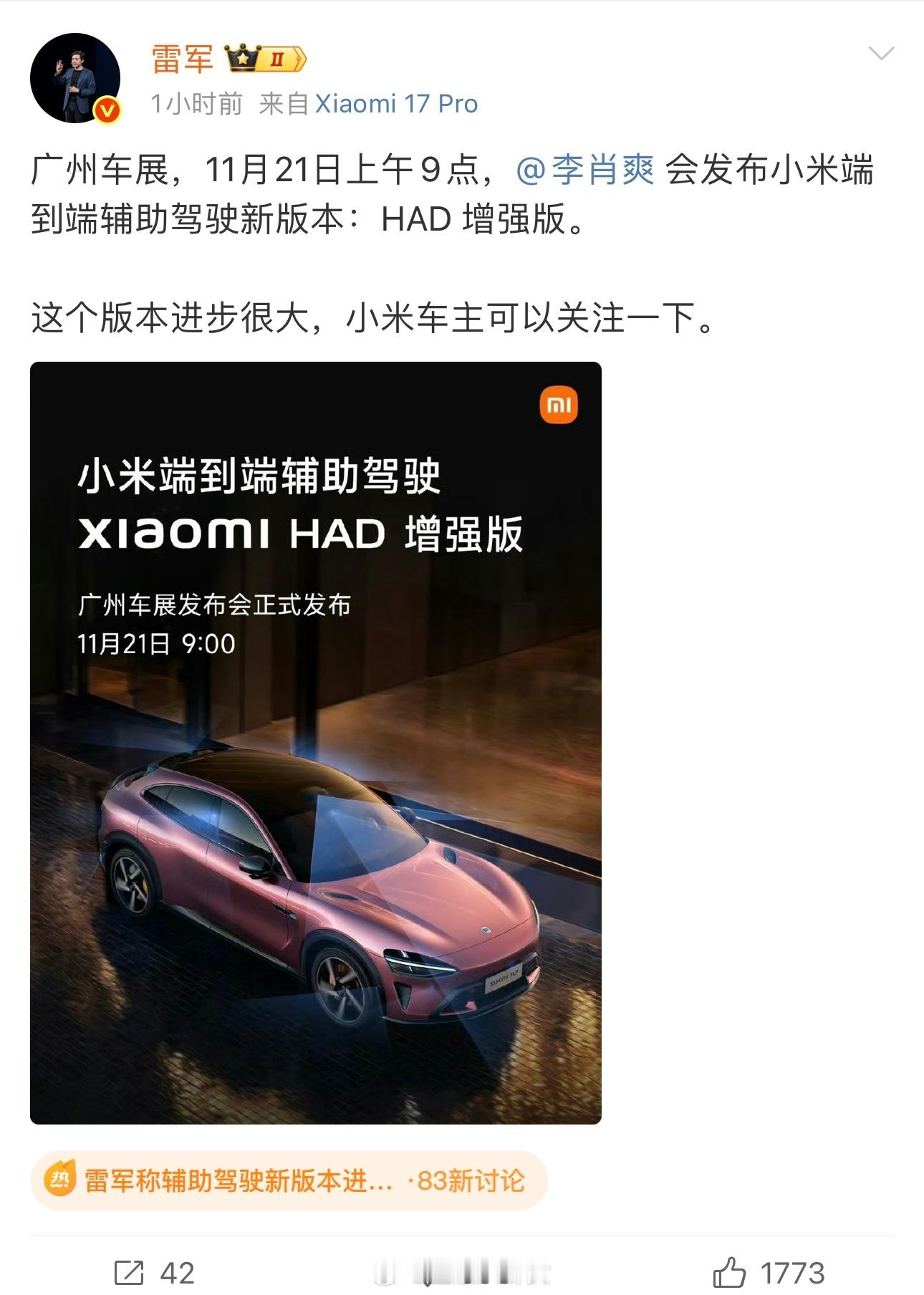 雷军 发文称:广州车展,李肖爽会发布小米端到端辅助驾驶新版本:HAD 增强版。这个版本进步很大,小米车主可以关注一下