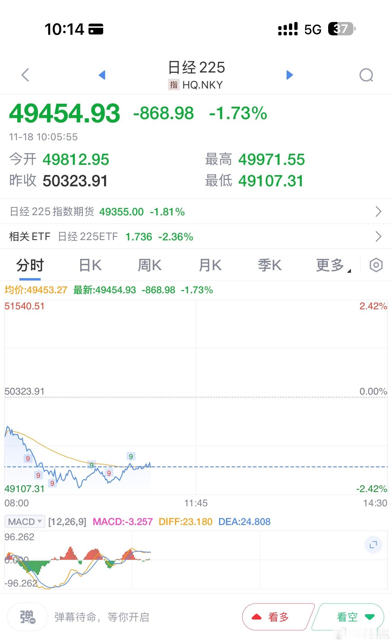 18日,日经225指数、东证指数均大幅低开,半导体和人工智能相关行业走低,信息通信和银行股也表现疲软。日经225指数今日跌超千点,跌幅超2.3%。
