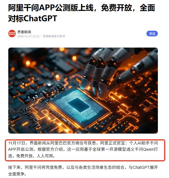 恐怕今年圣诞节,美国硅谷的巨头们都要彻夜无眠了!一场源自东方的科技风暴正在太平洋上空悄然酝酿,而风暴的中心,就在中国。这股力量,正让那些曾经不可一世的科技帝国,感受到了前所未有的寒意。 11月17日,阿里巴巴毫无预兆地正式上线了“千问APP”的公测版。这个消息犹如一颗投入平静湖面的重磅炸弹,瞬间在全球科技界激起了千层巨浪。 不少硅谷内部人士私下透露,许多顶级的AI实验室为此连夜召开了紧急会议,气氛紧张到了极点。 这并非一场突如其来的“珍珠港式”袭击。 实际上,早在今年9月,一场被业内称为“千问恐慌”(Qwen Panic)的情绪,就早已在加州圣克拉拉谷的空气中悄然蔓延。 根据全球最大开源社区Hugging Face的公开数据显示,当月的模型趋势榜前十名中,竟然有七个都属于阿里的“千问”系列。 这种景象,在过去是根本无法想象的。 它就像一支无形的东方大军,没有军旗,没有番号,却早已悄无声息地渗透进了全球数百万开发者的工作流之中,成为了他们日常开发中不可或缺的一部分。 这支“大军”的推进,远比任何商业推广都来得更加迅猛和彻底。 如果说这些开源模型的渗透还只是前哨战,那么一些行业领袖的公开表态,则真正敲响了警钟。 就连手握全球AI算力命脉的英伟达CEO黄仁勋,都在不久前的一次采访中公开承认,Qwen系列模型已经占据了全球开源模型市场的大部分份额。 更令人震惊的是,连美国本土的明星企业也开始“倒戈”。 全球知名的民宿平台Airbnb的首席执行官布莱恩·切斯基更是直言不讳,称其公司内部的许多AI创新功能,都在“大量依赖Qwen”。 这种表态,无异于在硅谷的心脏地带引爆了一枚舆论炸弹。 许多分析家猜测,这背后隐藏着一场深刻的战略博弈。 当谷歌、OpenAI等美国巨头们还固守着闭源收费的高墙,试图将先进的AI技术变成少数精英和付费用户才能享用的“奢侈品”时。 来自中国的玩家却选择了另一条截然不同的道路。 他们选择了彻底的开源和免费。这种策略看似放弃了眼前的商业利益,实则是在下一盘更大的棋。 它不仅极大地降低了全球开发者使用先进AI技术的门槛,更是在不动声色之间,争夺未来全球AI技术的话语权、标准和整个生态系统。 谷歌前首席执行官埃里克·施密特就曾对此忧心忡忡地公开表示,中国这种开放的策略,可能会促使世界上更多的国家和开发者,在技术选型时毫不犹豫地转向中国的AI技术栈。 一旦生态形成,后来者想要颠覆的难度将呈指数级增长。 而更具讽刺意味的是,这一切的发生,恰恰是在美国近年来最严厉、最全面的技术封锁大背景之下。 华盛顿的政客们本以为,只要切断高端芯片的供应,就能像掐住咽喉一样,扼住中国人工智能产业发展的命脉。 但他们显然是打错了算盘,也完全低估了一个东方大国在绝境中所能爆发出的巨大能量。 封锁非但没能阻止对手的脚步,反而像催化剂一样,激励中国开发出了更具全球竞争力的技术路径。 这无疑是对那些封锁政策制定者们最响亮的一记耳光。 就在11月14日,卡塔尔半岛电视台的一篇深度报道就一针见血地指出: 中国AI模型如今成功融入并“占领”硅谷开发者的工具箱,这本身就是对美国技术封锁政策最大的嘲讽。 历史再一次证明,真正的创新是无法被高墙所禁锢的。 如果说,之前遍布全球的开源模型是悄然渗透的“瓦格纳”式先头部队。 那么昨天“千问APP”的正式发布,就意味着一场决定未来科技格局的总攻,已经正式拉开了序幕。 这款APP的战略意图,已经昭然若揭。 它的野心绝非仅仅是成为另一个“会聊天”的ChatGPT复制品,而是要依托阿里庞大的商业生态,成为一个无所不能、无处不在的“超级入口”。 据阿里内部人士透露,管理层已将此役定义为“AI时代的未来之战”,其重要性不言而喻。 可以预见的是,在不久的将来,这款APP将深度接入地图导航、外卖、移动支付、办公软件等所有生活场景。 想象一下,一个完全免费,却能帮你预订餐厅、规划路线、处理工作邮件、甚至控制智能家居的个人AI助理,将会带来多么可怕的用户粘性。 这对目前仍然依赖用户按月订阅付费模式的ChatGPT等美国产品来说,几乎无异于一场降维打击。 免费的超级应用,对上付费的单一工具,这场战争的结局似乎从一开始就已经写下。硅谷的巨头们,这次恐怕真的要迎来一个不眠的圣诞季了。