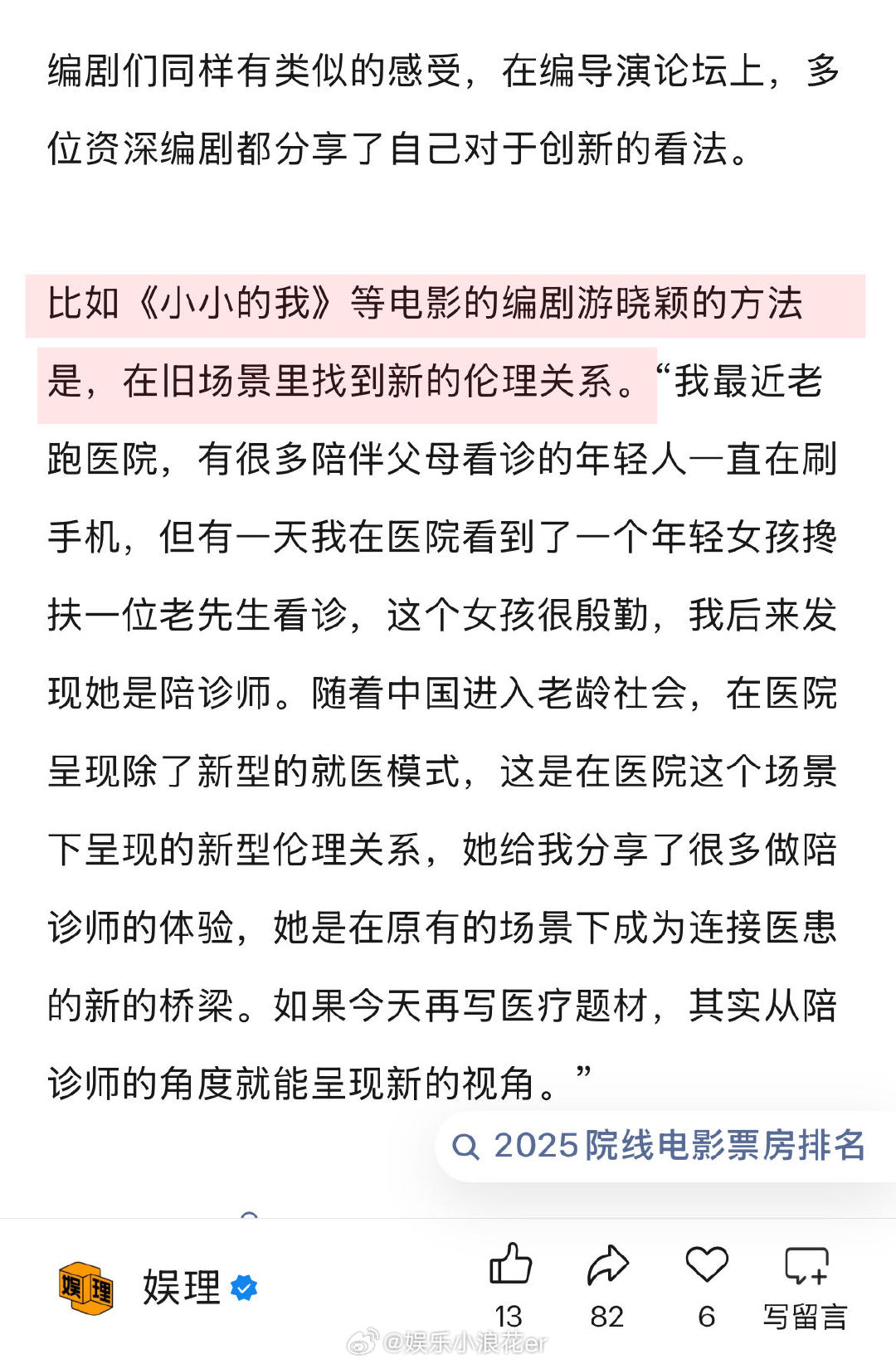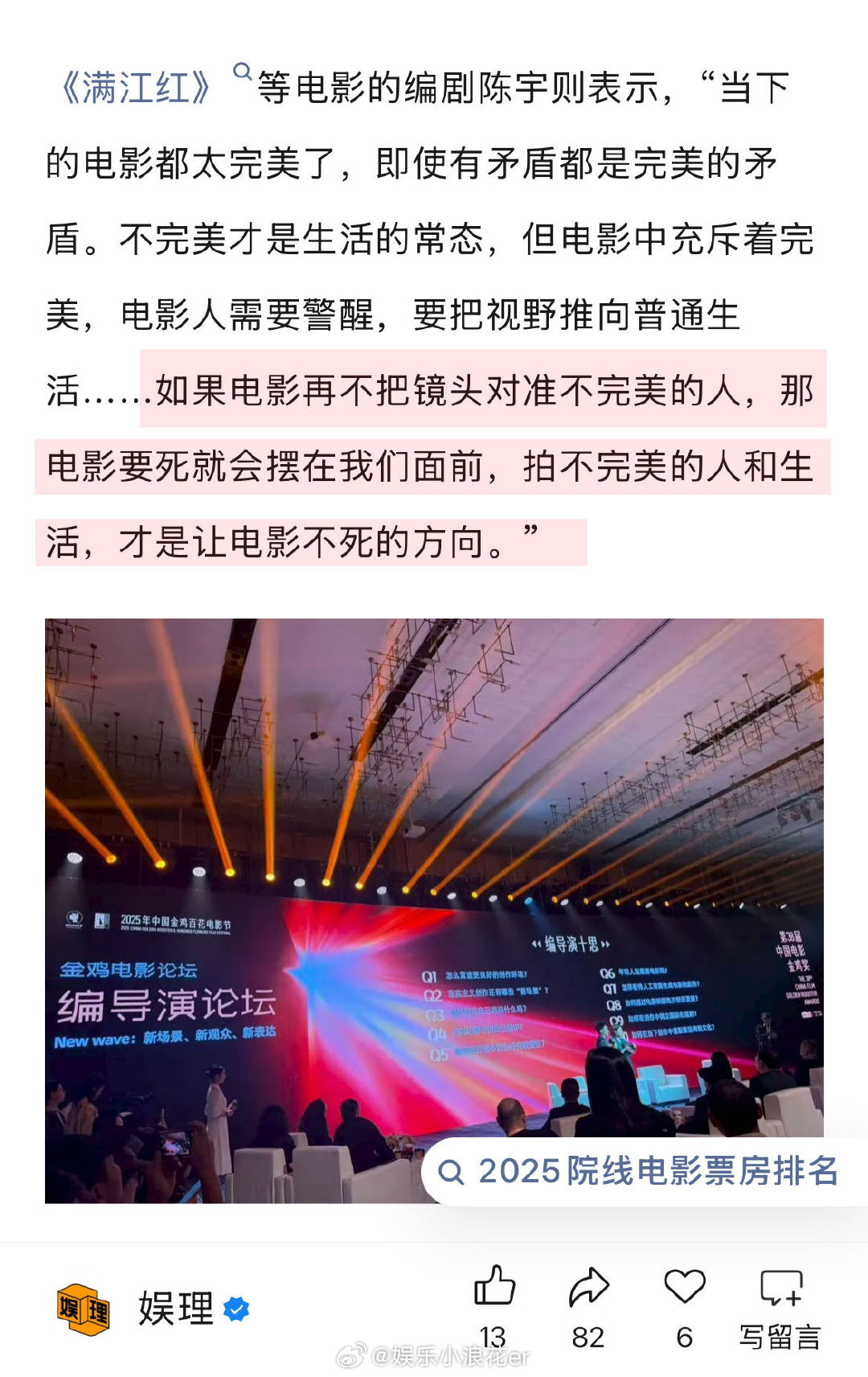 在金鸡的编导演论坛上,多位资深编剧都分享了自己对于创新的看法。《小小的我》等电影的编剧游晓颖的方法是,在旧场景里找到新的伦理关系。《满江红》等电影的编剧陈宇则表示,“当下的电影都太完美了,即使有矛盾都是完美的矛盾。如果电影再不把镜头对准不完美的人,那电影要死就会摆在我们面前,拍不完美的人和生活,才是让电影不死的方向。”↓