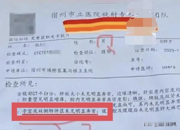 真让人哭笑不得!宿州一大哥做腹部CT,三甲医院竟查出“子宫正常”! 近日,宿州一大哥的就医经历直接冲上年度最佳离谱榜。明明是纯纯的大老爷们,宿州市立医院的CT报告却写着“子宫及双侧附件区未见异常”。 大哥吐槽:我一个男的,凭空多了子宫?不愧是三甲医院,这诊断太“惊喜”了! 网友笑疯了:这是给大哥解锁了隐藏生理结构? 当了几十年男人,终于可以做回女人。有了子宫,赶紧生小孩。 这笔误也太离谱了。 大家对此事怎么看? 图源自网络。鸣谢!