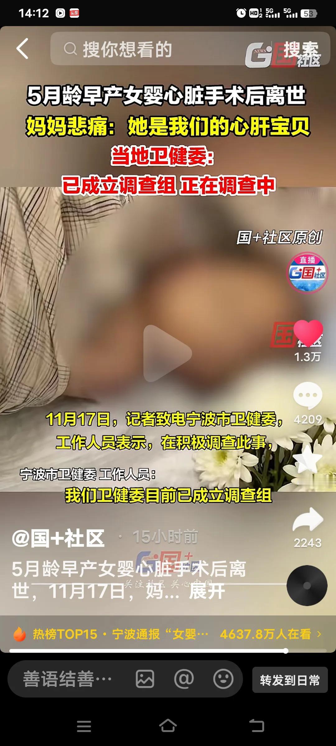 痛心至极!浙江宁波一位家长发帖称,她5个月大的早产女宝因心室缺损,在宁波大学附属