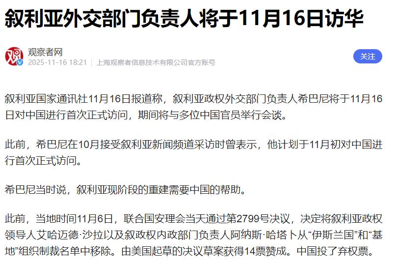 果然不出所料:朱拉尼派人到北京,要求中国“放他一马”。 11月6日,安理会第2799号决议投票很能说明问题,俄罗斯、美国这些立场差着十万八千里的国家都罕见地站到了一起,唯独中国亮了弃权牌,这态度再明确不过:你朱拉尼的事,我们并不满意。 朱拉尼急着派人来,核心是踩了中国的红线还想捞好处。谁都知道“东伊运”是被联合国盯上的恐怖组织,这伙人在新疆制造过多少恶性事件不用多说,中国在反恐上从来都是零容忍。 可朱拉尼倒好,为了自己的小算盘,居然把这组织的头目拉进政府当高官,这不是明着挑衅吗?上海国际问题研究院的专家都提过,中国早就通过外交渠道提醒过他,可他压根没当回事,现在制裁刚解就来求和,哪有这么便宜的事。 更现实的是,叙利亚打了十多年仗,基础设施全毁了,外汇储备几乎归零,想重建光靠美俄的口头支持没用。中企在中东的工程经验摆着呢,从伊拉克到巴基斯坦,只要中国点头,资金、技术、管理能打包送上门,这种硬实力全球没几个能比。 朱拉尼心里门儿清,没中国出手,他的重建就是纸上画饼,短时间根本就难有成果。可他忘了,中国的合作从来有底线,安全关切不解决,想拿项目纯属做梦。 希巴尼这趟访问的低调劲儿,简直是把“心虚”写在了脸上。没有外交部发布会,没有提前公布议程,连机场接机流程都没有,活脱脱一场“静音式访问”,到现在叙利亚官方都不敢说要见谁、谈几天。 反观我们这边的应对更有意思,不拒绝也不热络,这种“软冷处理”比直接说不更有分量——你还没资格让我们正经回应。 更关键的是,朱拉尼以为解除个人制裁就万事大吉,其实他的老巢“沙姆解放组织”还在安理会制裁名单上,里面80多个实体、250多个人的资产全被冻结,旅行、武器买卖全受限。 就算朱拉尼能以临时总统身份见外宾,他的组织连国际银行的账都用不了,公职人员工资都发不出来。这种情况下,我们要是不松口,国际资本谁敢往叙利亚砸钱?毕竟没人愿意跟恐怖组织沾边的势力做生意。 美国和俄罗斯赞成解除制裁各有算盘,美国要战略利益,俄罗斯要驻军默许,可我们却不吃这一套。傅聪大使在安理会说得很明白,提案国为了自己的议程强行推动投票,连反恐条款都不肯加,这种决议中国没法赞成。 朱拉尼大概是后来才反应过来,美俄的支持是掺了水的,只有中国的态度能决定他能不能真正站稳脚跟,这才急吼吼派心腹来北京,而我们的要求也想来也很简单——跟恐怖组织划清界限。