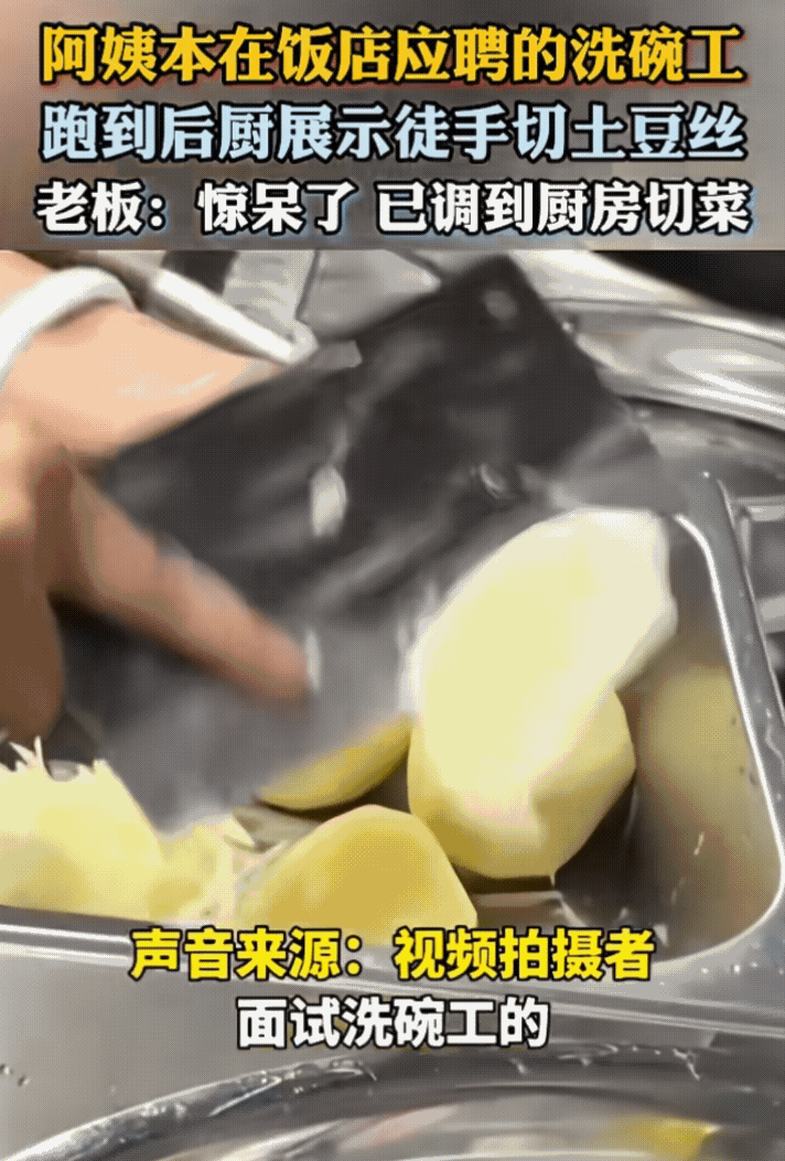 阿姨本来应聘的是洗碗工,跑到厨房徒手切土豆丝 ,老板惊呆了 ,阿姨已被调到厨房切菜了 。 网友热议,有网友说:“厨房的刀比家用的要锋利的多,她这控制的也太好了。” 还有网友说:“我只能在手上切豆腐,没想到还能切土豆丝!” 看到阿姨的刀工,相信阿姨平时也没少切菜 ,熟能生巧,能把工作做的越来越好,越来越精 。 晒图笔记大赛 (信息来源:新华社)