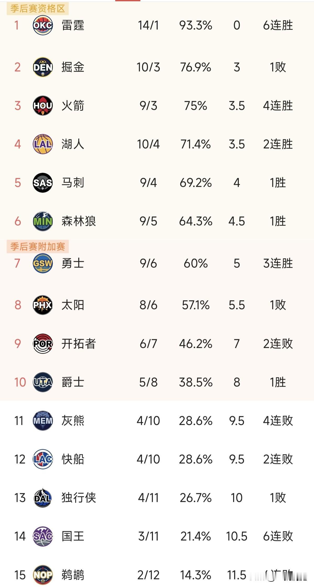 掘金主场居然三分惜败输给东部第八的公牛(赛后排名),快船两分输给76人,雷霆还是很稳定的拿下比赛,目前继续排名西部第一同时也是联盟第一,掘金输球后还是排名西部第二,火箭如果下一场赢球后不知道怎么排名。西部现在排名如下: