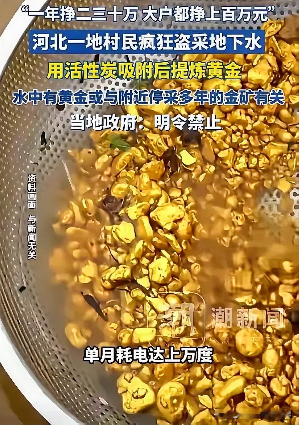 贪心不足蛇吞象!11月16日发布,河北一村民抽地下水使用,竟然在水里发现了黄金,他却没有上报,而是偷偷在自家院子里打深井,不断抽地下水炼黄金,这还不止,他还把这事告诉了村民,结果不少人都加入其中,一个月用电量超1万度,村里的“大户”一年纯利能超百万! 这个藏在河北青龙满族自治县凉水河乡清河沿村的“秘密”,绝非简单的致富经,而是一场以透支子孙后代生存资源为代价的疯狂赌博。村民们采用的“抽水吸金”法看似聪明:把地下水抽上来,流过装满活性炭的大铁桶,金子吸附在炭上,废水直接排进河道,每隔几个月把吸饱金的活性炭拿去焙烧提炼,就能换来真金白银。暴利驱使下,整个村子陷入一场地下“军备竞赛”,井越打越深,水泵越换越大,昼夜不停的抽水声取代了往日的宁静。 这场狂欢的成本,最终由村里的普通百姓和周边环境默默承担。疯狂抽水直接导致地下水位急剧下降,枯水期时,村里五十多户人家的水井彻底干涸,连日常饮水都只能从外面运回来。更令人担忧的是,含有金元素的重金属废水未经任何处理就直接排入河流,专家指出这会造成严重的二次污染,重金属在环境中积累,可能通过食物链最终危害人体健康。这种“家家点火、户户冒烟”的粗放提炼,本质上是在用整个社区的可持续生存环境换取少数人眼前的暴利。 表面看是村民法律意识淡薄,根子却暴露了监管的疲软和滞后。尽管当地水务局在8月对一名村民开出了2.3万元的罚单,乡政府也发布了停止违法行为的告知书,但面对动辄数十万、上百万的年利润,这点罚款简直不痛不痒。以至于罚单开出后,10月下旬记者走访时,新的水井依然在不断开挖。打井队负责人一语道破天机:“老百姓打吃水井哪天天报备?”监管的长期缺位,无形中助长了这种“不抽白不抽”的侥幸心理。 各位读者你们怎么看?欢迎在评论区讨论。