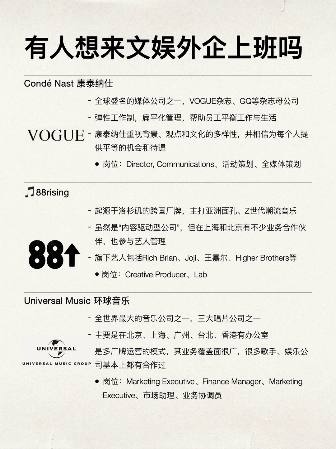 如果你喜欢电影、音乐、综艺、IP、内容创作……那文娱类外企是真的会很香!这次整理了几家做文化、娱乐、传媒相关的外企,团队氛围轻松,有很多创意流动,很适合年轻人。