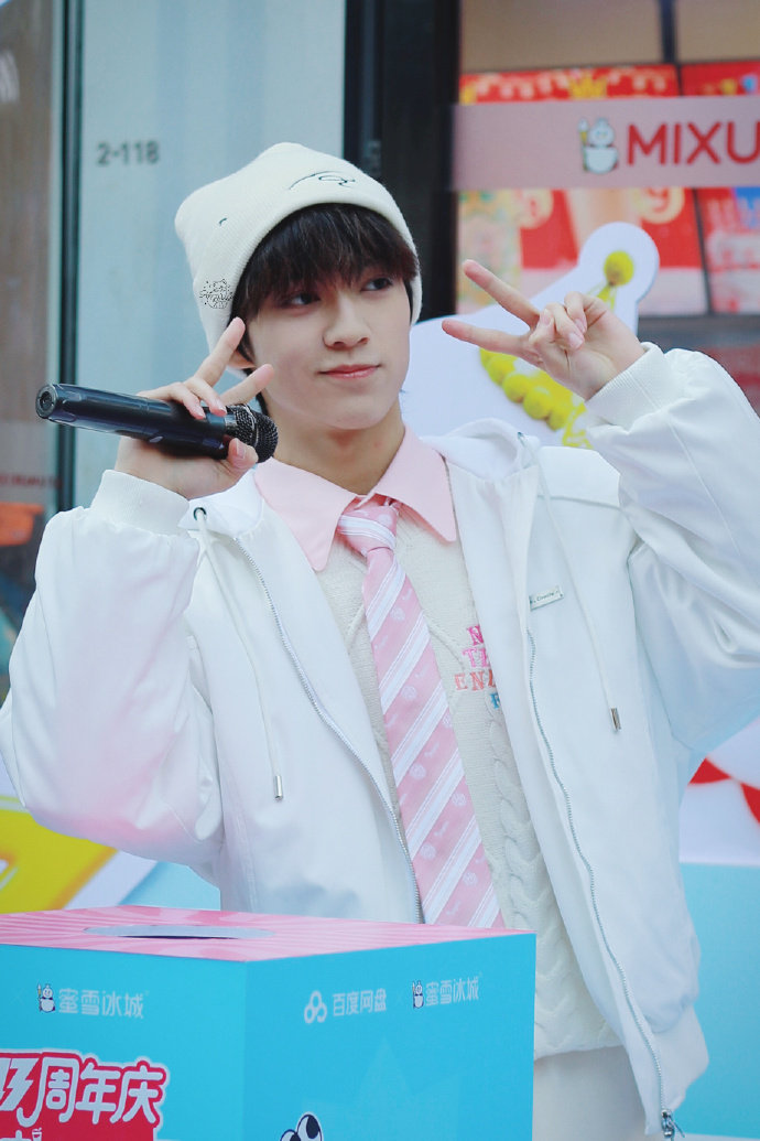 陈天润一日店长纯白look,纯白造型搭配粉领带衬衫,完全青春可爱啊~