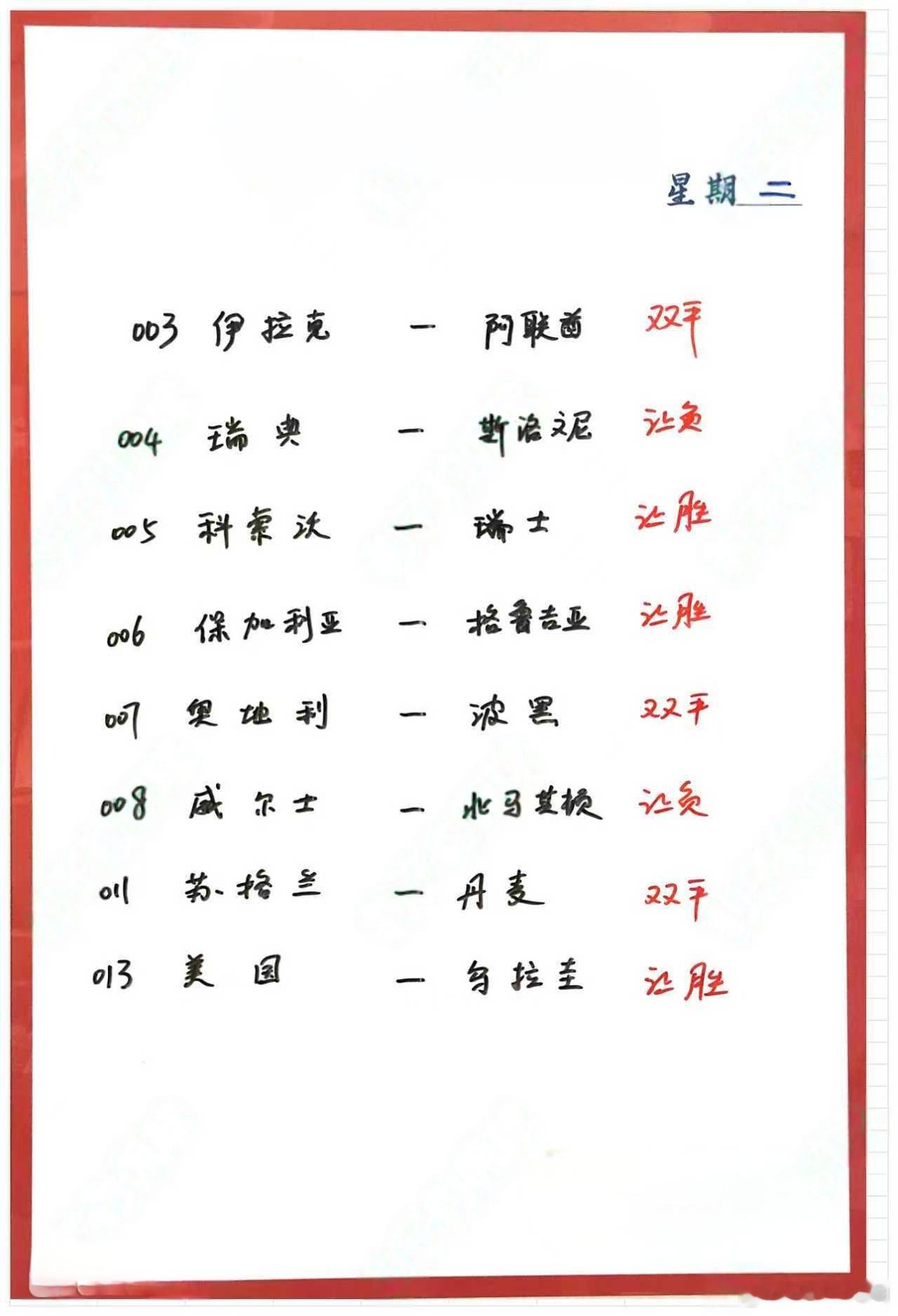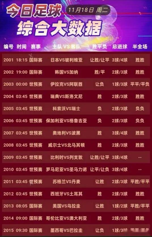 11月18日001 日本 VS 玻利维亚002 韩国VS 加纳003 伊拉克VS 阿联酋004 瑞典VS 斯洛文尼亚005 科索沃VS 瑞士006 保加利亚VS 格鲁吉亚 008 威尔士VS 北马其顿