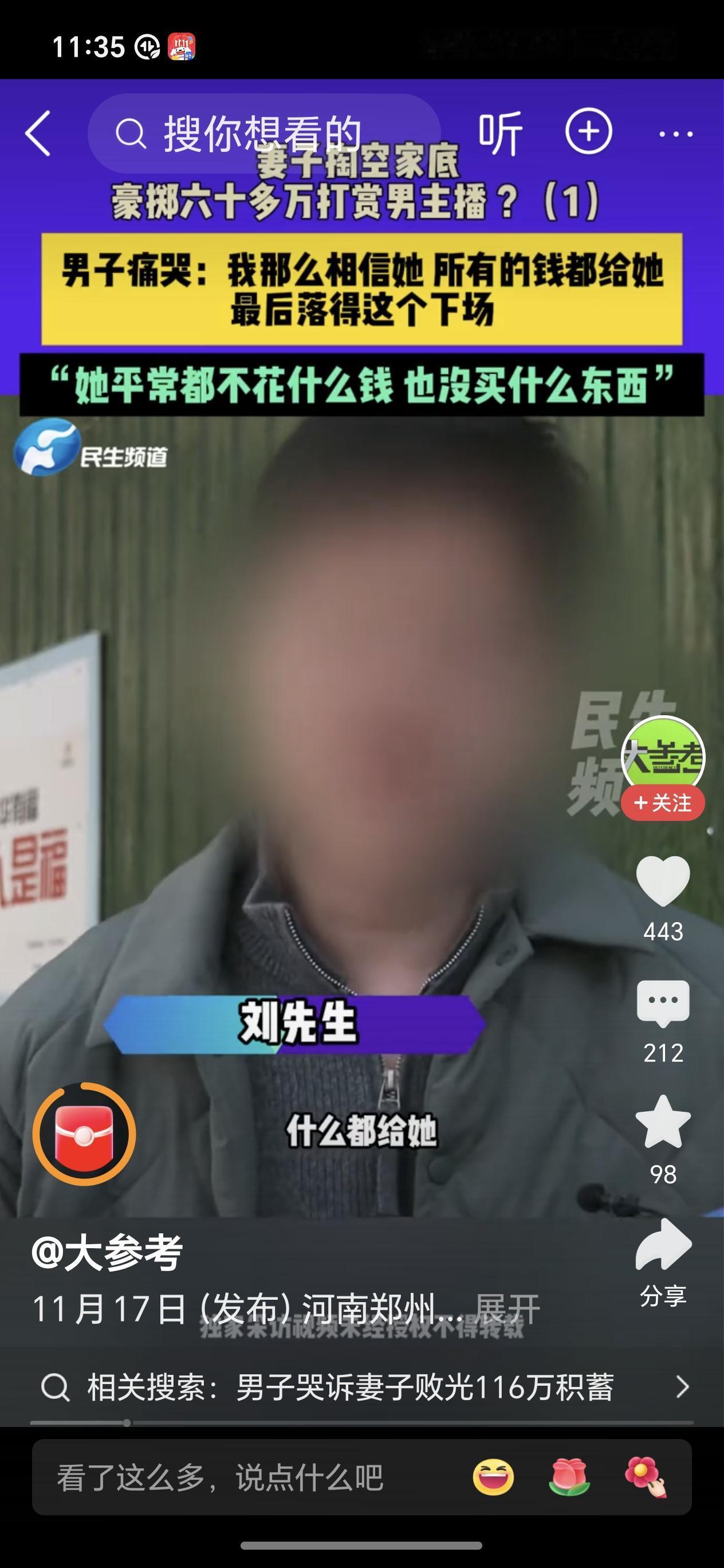 男子哭诉妻子败光116万积蓄败家娘们太气人了!河南郑州一男子辛苦打工八年赚了116万,钱都交给妻子保管,可最后发现钱没有了,原来被妻子败光了,这妻子光打赏男主播就花了67万,其它几十万连她自己都不知道花在哪里,不但花光积蓄,还欠了8万的网贷。这女人不能要了太可恶了!