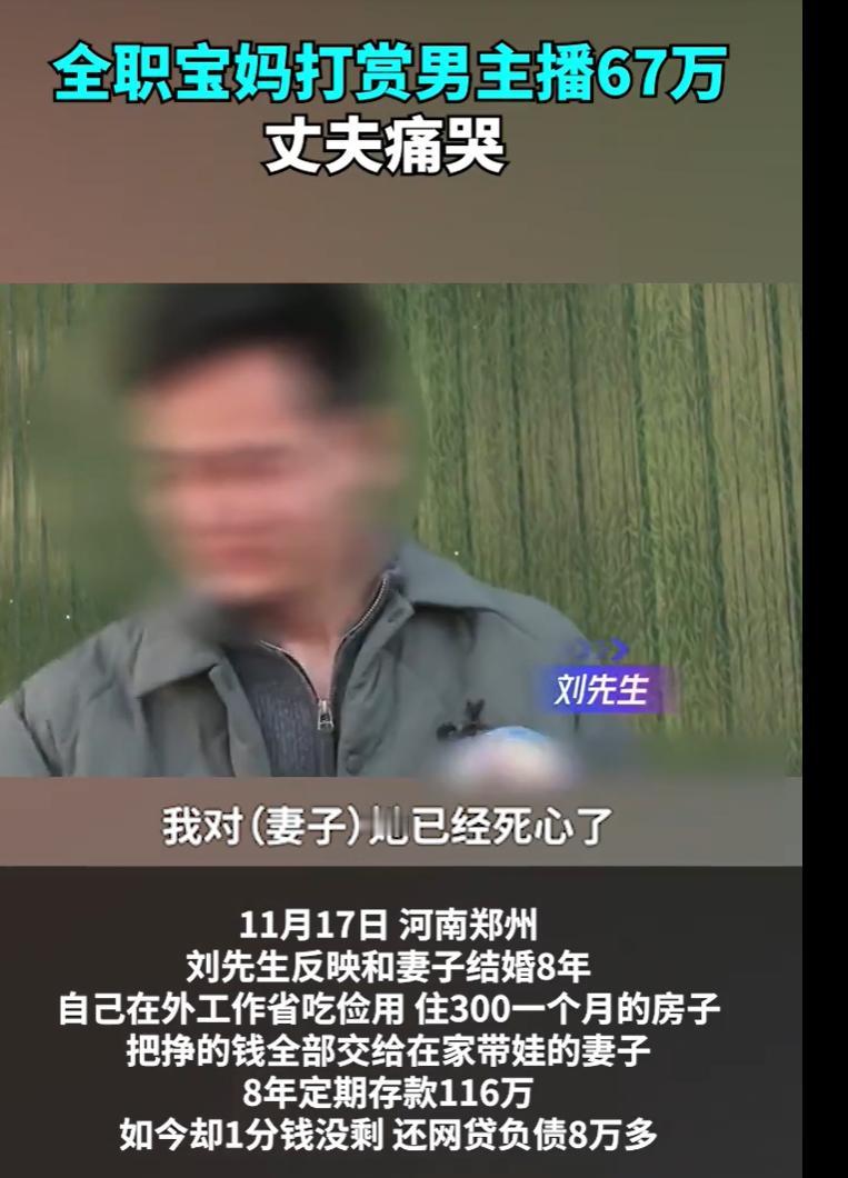 女子打赏男主播67万,丈夫痛哭:我对她心死了! 刘先生自述:“八年来,我省吃俭用,妻子婚后一直没有工作,在家照顾小孩,为了让妻子有安全感,所有积蓄都交给她保管,没想到她竟然打赏男主播。” 鸡蛋为什么要放在一个篮子里? 这位刘先生和妻子各打五十大板,妻子太轻易得到了只会觉得赚钱容易,而刘先生未免也太相信妻子了吧! 我就从来不相信人性,每个人都是自己金钱的掌控者,但赚钱多难只有赚钱的人知道,花钱的人从来不在乎。 刘先生哪怕再爱妻子,认为钱比妻子重要,就要全部给妻子,也要结合现实情况考虑啊! 夫妻两人长期不在一起居住,很容易产生情感缺位,致使感情变淡,出现冷漠和疏离感。 男人有钱会变坏,同样也适用于女人,更何况一百多万又不是自己赚的,打赏男主播也是为了满足了自己的情绪价值,网络害人啊!主播打赏 直播打赏骗局 主播打赏退款 理智打赏主播 直播打赏诈骗 主播打赏收入 直播打赏主播