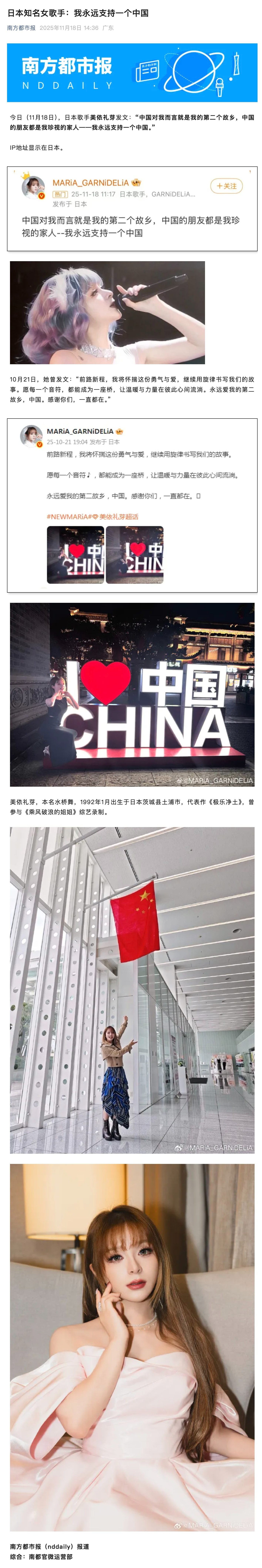 【:我永远支持一个中国】11月18日,日本歌手美依礼芽发文:“中国对我而言就是我的第二个故乡,中国的朋友都是我珍视的家人——我永远支持一个中国。”IP地址显示在日本。10月21日,她也发文表示:“前路新程,我将怀揣这份勇气与爱,继续用旋律书写我们的故事。愿每一个音符 刀,都能成为一座桥,让温暖与力量在彼此心间流淌。永远爱我的第二故乡,中国。感谢你们,一直都在。”公开资料显示,美依礼芽,本名水桥舞,1992年1月出生于日本茨城县土浦市,代表作《极乐净土》,曾参与《乘风破浪的姐姐》综艺录制。