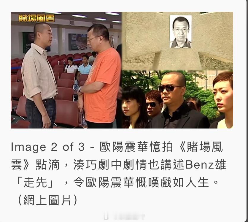 【明報即時】歐陽震華憶拍《賭場風雲》 讚許紹雄神級演技 感嘆戲如人生 歐陽震華表示許紹雄是他的大師兄,2人正式結片緣是《賭場風雲》。(鍾偉茵攝)許紹雄(Benz雄)今天(18日)出殯,不少圈中好友到靈堂送別Benz雄,有份為好友扶靈的歐陽震華,完成所有儀式後接受訪問,他表示Benz雄是他的大師兄:「佢早我10年,佢(藝訓班)第一期,我第十期,我哋正式結片緣係《賭場風雲》,講我﹑Benz及三哥(苗僑偉),劇中喺3個好兄弟,頭先係靈堂撞到阿戚同三哥,我同三哥有份幫Benz扶靈,跟住阿戚同我講,嗰陣時最開心係睇住我哋幾個拍《賭場風雲》,估唔到好似劇情咁樣,佢(Benz)走咗先,我聽到呢句說話真係...人就係咁簡單,戲如人生,好似我哋3個戲中做3兄弟,戲中Benz雄走咗,套劇都20年前,2005年拍,大家都有情有義,祝佢去一個佢好想去嘅地方。」問可有難忘拍攝回憶?歐陽震華說:「好多,佢(Benz)走嗰日,我喺微博寫咗幾句,我拍《賭場風雲》之前,係覺得自己係主角,可以好多方面懶係獨當一面,但拍《賭場風雲》我對住許紹雄,我簡直無地自容,呢啲先係神,佢做乜嘢都得,做乜都稱職,佢百搭㗎,我頭先喺靈堂同鍾澍佳傾開,我話真係可惜,呢個圈又少咗一位令觀眾睇到五體投地嘅人,有邊套戲﹑邊個劇有Benz雄喺裏面,部劇會定好多,無論收視﹑票房都會定好多,多謝Benz畀到大家咁多歡樂。」問到2人私下相處難忘事?他說:「我哋做呢行好怪,喺部劇好熟好熟好熟,但拍完部劇之後,會有幾多次再見面,呢個唔敢包,我同佢(Benz)以前視藝會足球隊一齊踢波,佢做會長﹑係搞手,我哋嗰陣成日踢波見面,後來個會冇再搞,好多時候喺場合見過面,最近2年都見過。(有沒有聽過他近年身體出現問題?)完全唔知,唔知佢刻唔刻意隱瞞,佢係一個唔想人麻煩佢,佢亦唔想麻煩人嘅一種人,同我差唔多,我都唔鍾意麻煩人,我覺得係咁,我覺得佢心態上好開朗豁達,覺得個個人都會行呢條路,睇下邊個上車及落車先。(最後一次私下聚會?)成年之前喇﹗(收到消息好突然?)收到(黎)芷珊Call我﹑阿佘Call我,我咪即刻去養和,唔係放低工作,嗰日我啱啱瞓醒,就落去睇下,咁嚴重,我都晴天霹靂,之前睇片見佢同個女打機,所以珍惜眼前人﹑珍惜現在,開開心心。」(即時娛樂)