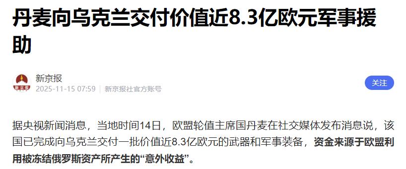也算是开了眼了,丹麦给乌克兰送了8个多亿欧元的武器,结果一查账单,买单的还是俄罗斯自己。 11月14日,丹麦向乌克兰交付的8.3亿欧元武器装备,堪称本年度国际政治舞台上最具讽刺意味的操作——这笔巨款既不是哥本哈根的财政拨款,也不是欧盟的集体出资,而是直接取自被冻结的俄罗斯资产产生的利润,相当于俄罗斯自己掏钱给对手添置军备。 这波操作并非丹麦单独行动,而是欧盟整体策略的延伸,早在去年5月,欧盟理事会就已通过专项法案,明确允许将被冻结俄资产在欧盟中央证券存管机构产生的净收益用于对乌军援,其中90%通过欧洲和平基金框架拨付,10%纳入欧盟预算用于乌国防工业建设和重建。 这套机制运行半年后,丹麦此次的8.3亿欧元援助已是欧盟第二次动用这类“特殊资金”,第一次是今年7月拨付的15亿欧元,当时就有14亿直接用于采购防空系统和炮弹等军事装备。 俄乌冲突升级后,欧盟冻结的俄罗斯央行资产约2000亿欧元,其中90%由总部位于比利时的欧洲清算银行控制,这些资产每年产生的利息就高达30亿欧元。也就是说,单靠利息收入,欧盟每年就能为乌克兰提供稳定的资金支持,丹麦这次的8.3亿不过是其中的零头。 但这笔钱拿得并不轻松,比利时作为资产托管大国一直忧心忡忡,因为一旦俄罗斯以非法挪用为由提起诉讼,布鲁塞尔可能要承担巨额法律风险。 这也是为什么欧盟内部在推动该政策时分歧不断,德国就反复强调“只动收益不动本金”,试图在援乌和维护金融信用间找平衡,而欧盟委员会主席冯德莱恩则更激进,还在推动“赔偿贷款”计划,打算以冻结资产为抵押向市场融资,进一步放大援乌资金规模。 俄罗斯方面自然不会坐视不理,外交部早在今年5月就警告过“将采取全面报复”,实际上他们已经冻结了欧洲国家在俄的对等资产,形成了互相牵制的局面。 这种“冻结-反冻结”的博弈让整个事件更具戏剧性,原本用来施压俄罗斯的制裁手段,如今变成了持续援乌的“提款机”,而俄罗斯自己的资产产生的利润,反倒成了打击自身的武器。 有意思的是,欧盟这套操作还在不断突破既有规则,过去国际社会对冻结资产的处理极为谨慎,主要以保管为主,很少直接挪作他用,现在欧盟不仅动用收益,还在研究更复杂的金融工具,这难免让其他国家对海外资产安全产生担忧。 不过对当下的欧盟来说,只要能持续支持乌克兰,这些风险似乎都成了可以承受的代价,毕竟用俄罗斯的钱打俄罗斯,这种“以彼之道还施彼身”的做法,既减轻了自身财政压力,又能精准打击对手,堪称一本万利的政治账。