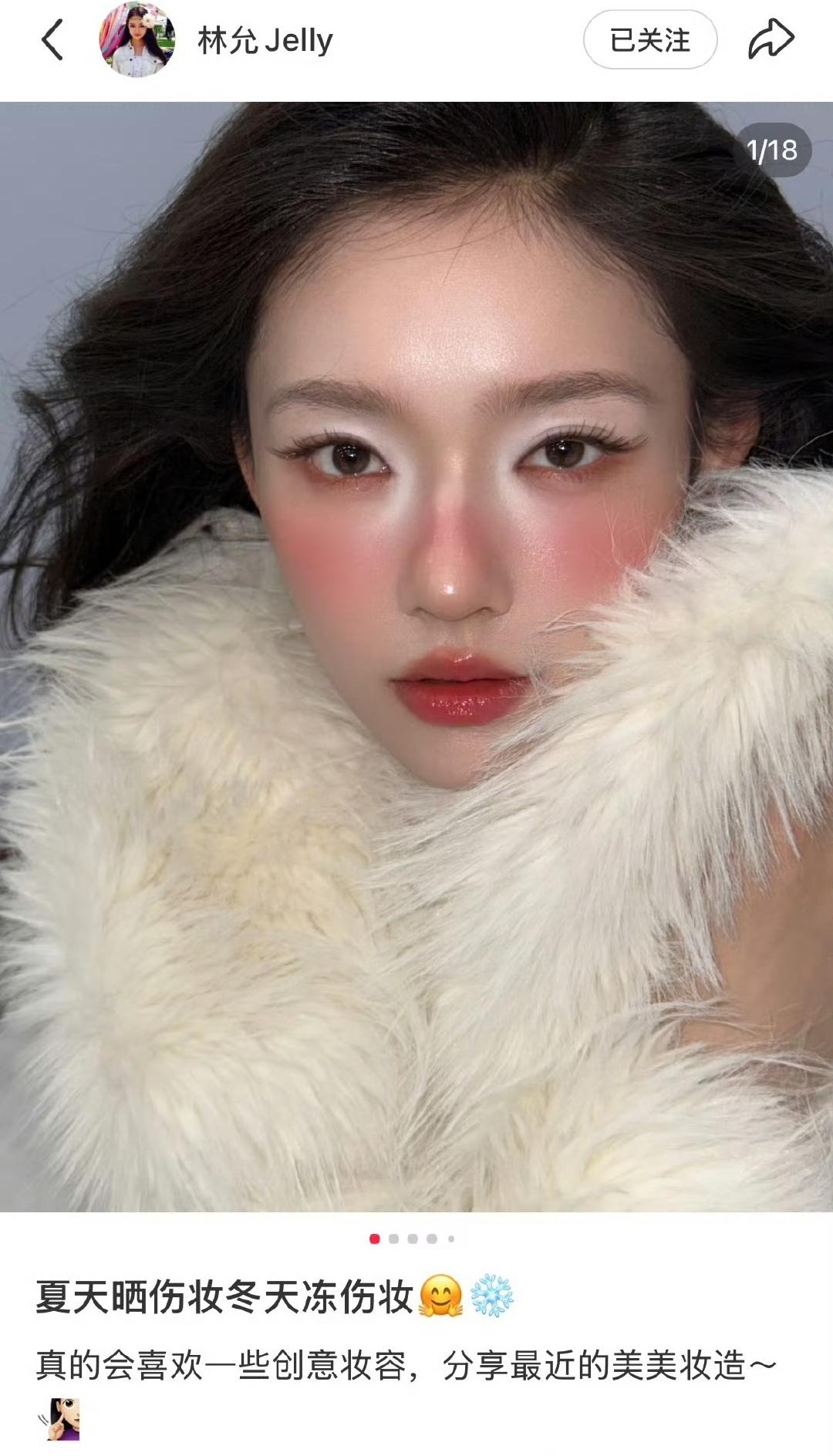 女明星林允晒自己的冻伤妆,还说自己就喜欢这些创意妆容,夏天弄晒伤妆,冬天整冻伤妆 平心而论,大家都摸着自己良心说 她这个妆容好看吗 我觉得不好看,冻伤妆、雀斑妆 以前都是欧美人玩的那一套,人家皮肤粗糙 五官立体 可能适合 但是咱们亚洲人学人那一套就有点不合适了 尤其这个冻伤状,我怎么看怎么别扭,真不如林允自己不化妆的时候 现在也就是大家生活好了 吃饱了 穿暖了 非得给自己弄成什么冻伤饿伤 可真要把这些明星冻着了 他们肯定又不乐意了