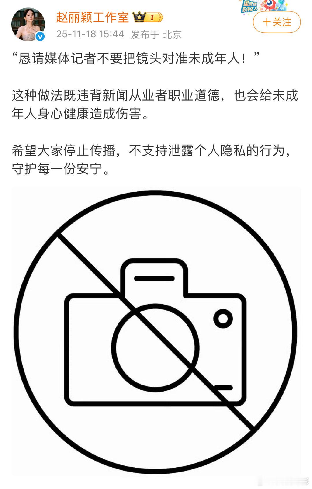 赵丽颖工作室发文恳请媒体记者不要镜头对准未成年人:“这种做法既违背新闻从业者职业