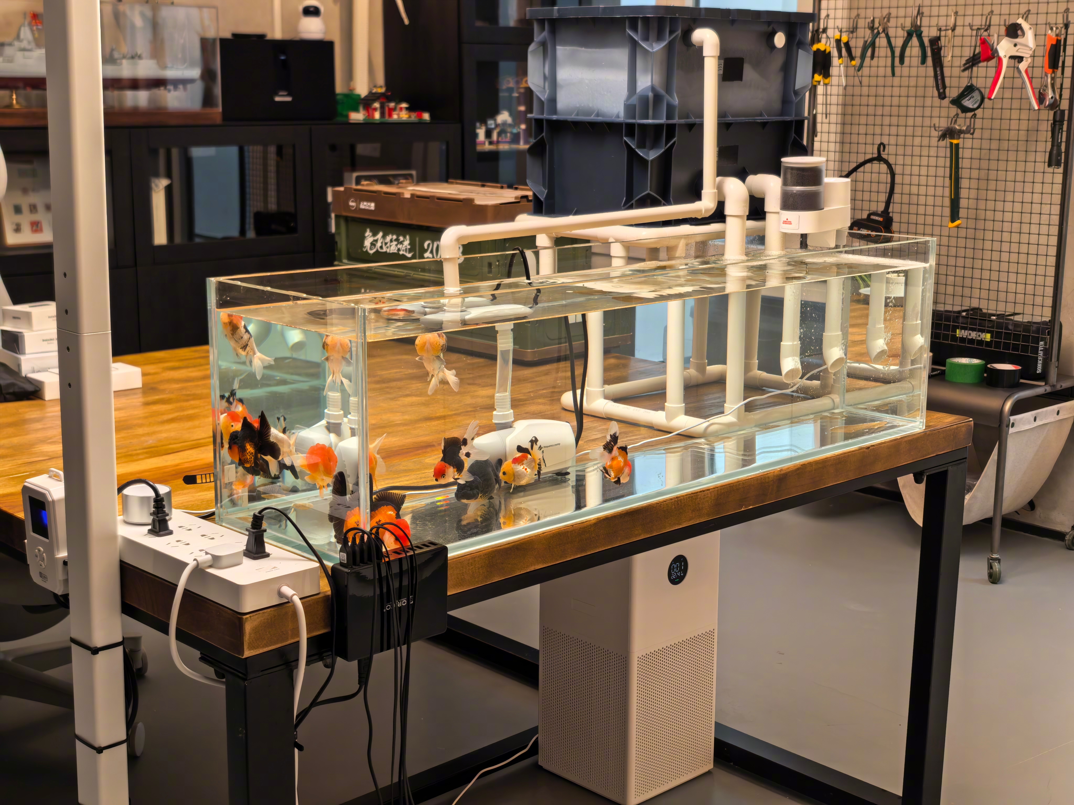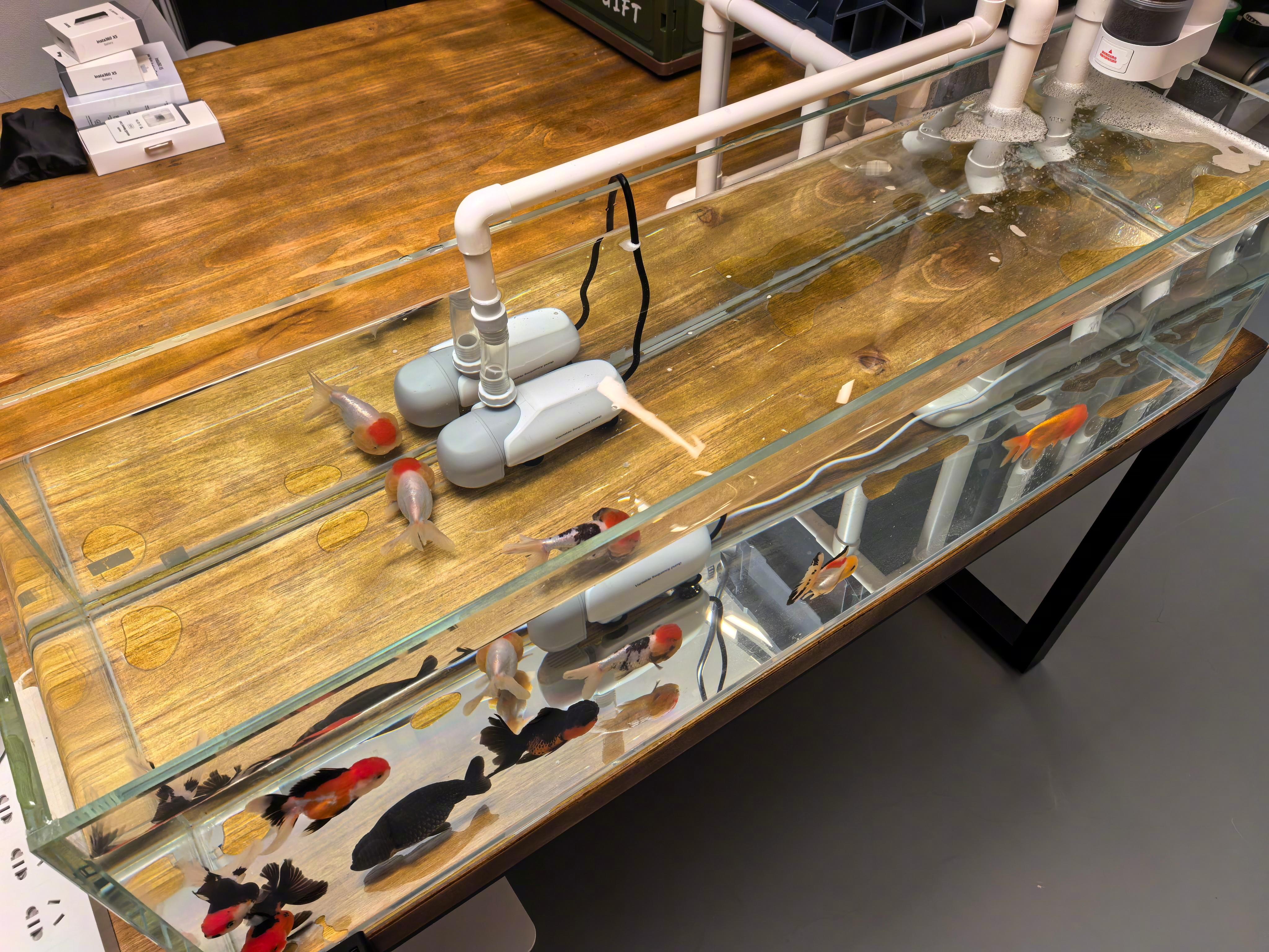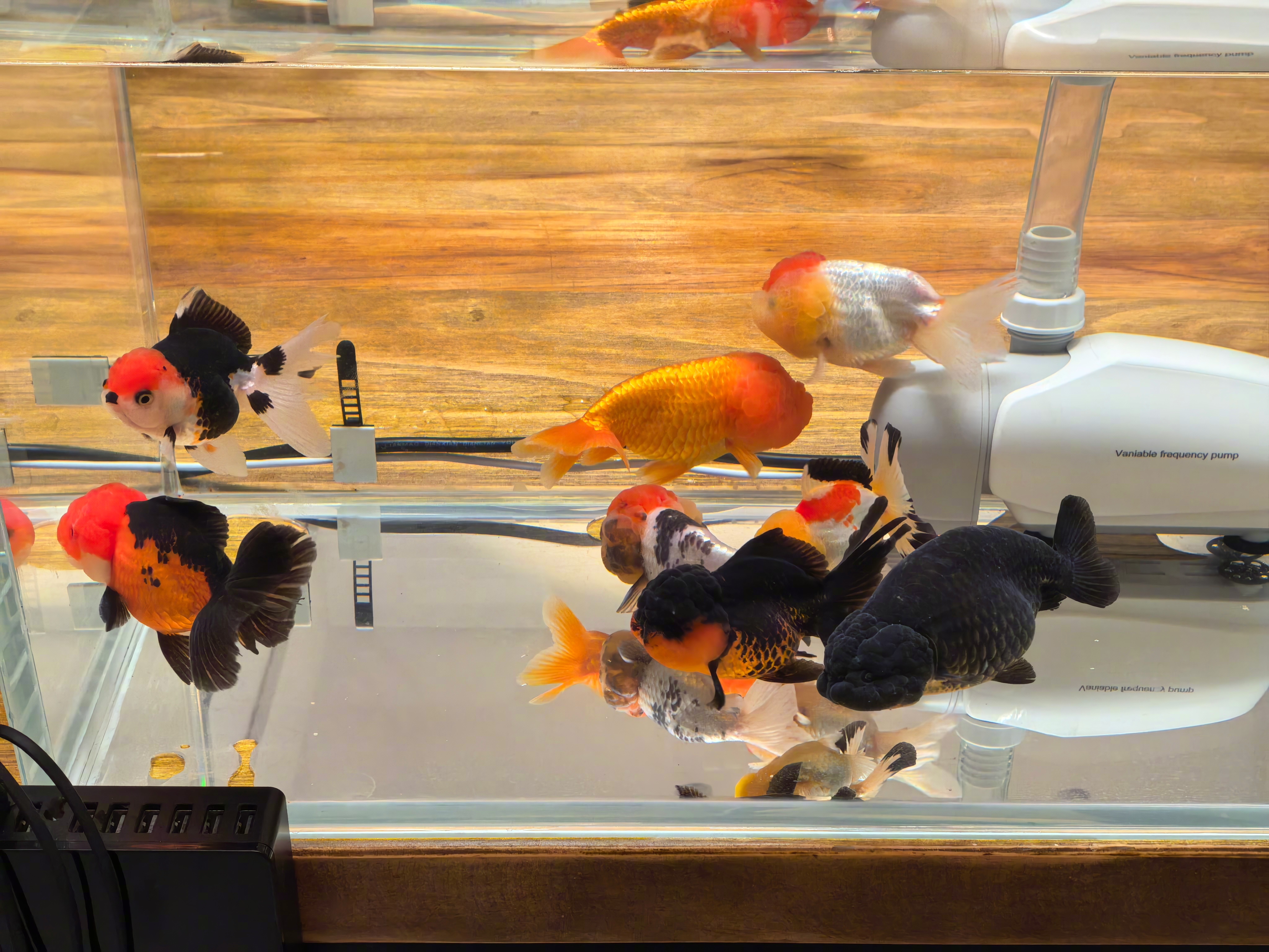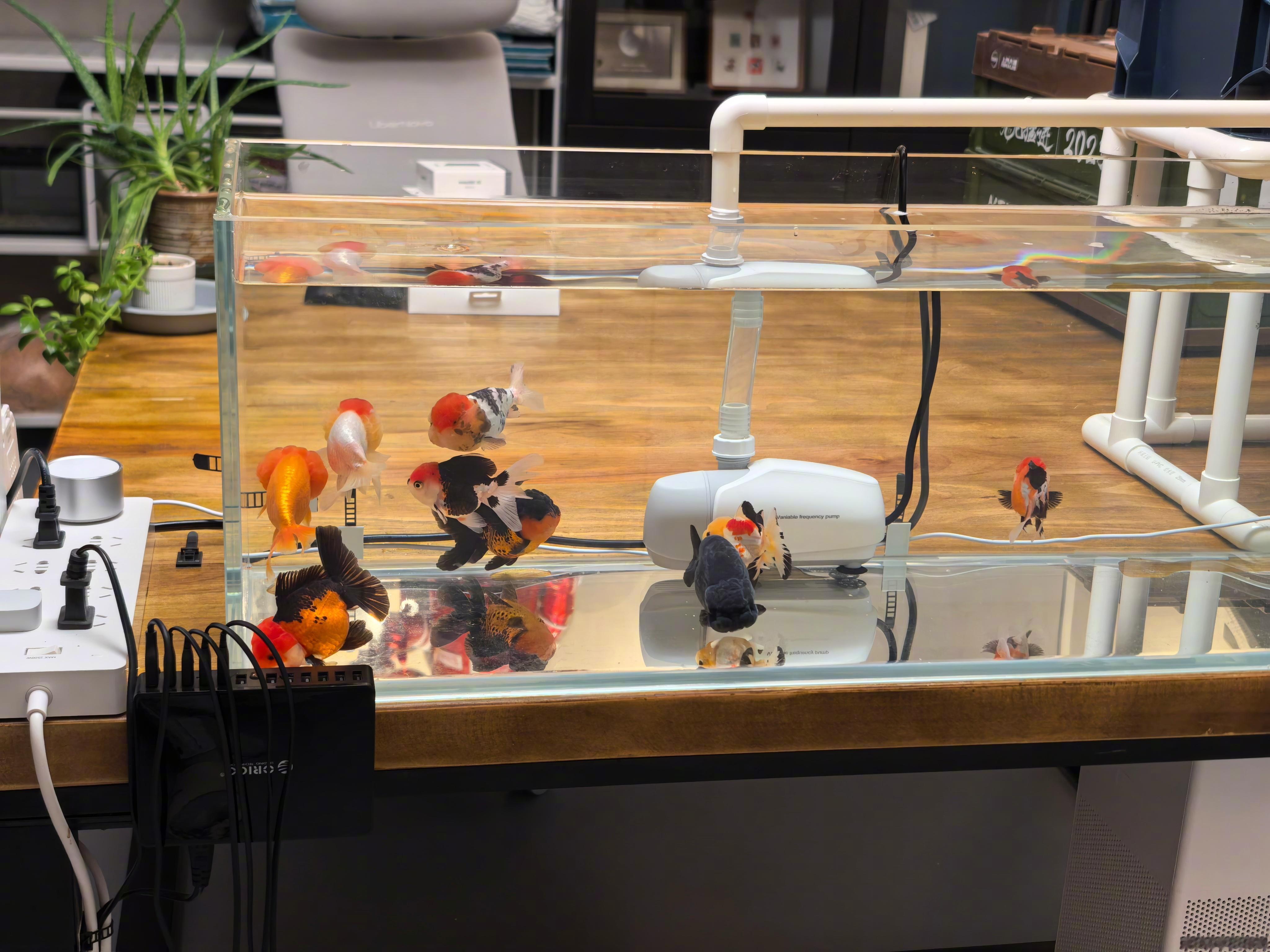 最终4条兰寿金鱼、5条泰狮金鱼,下缸。似乎这个1.1米x0.3米x0.3米的缸,还可以再养多几条啊,有些空旷。